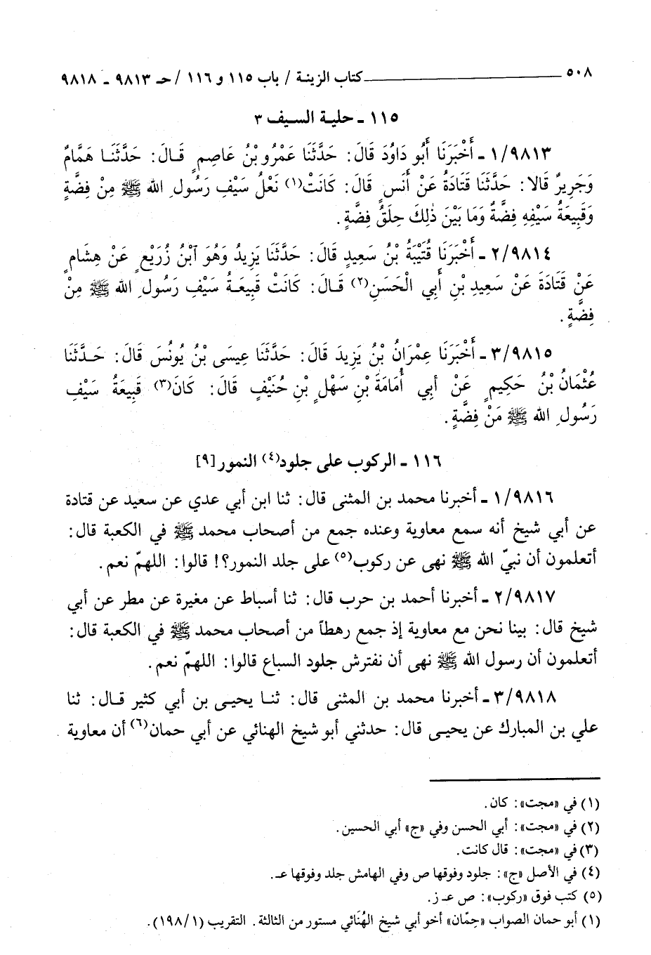 9816 - أخبرنا محمد بن المثنى قال ثنا بن أبي عدي عن سعيد عن قتادة عن أبي شيخ أنه سمع معاوية وعنده جمع من أصحاب محمد صلى الله عليه و سلم في الكعبة قال أتعلمون : أن نبي الله صلى الله عليه و سلم نهى عن ركوب على جلد النمور قالوا اللهم نعم