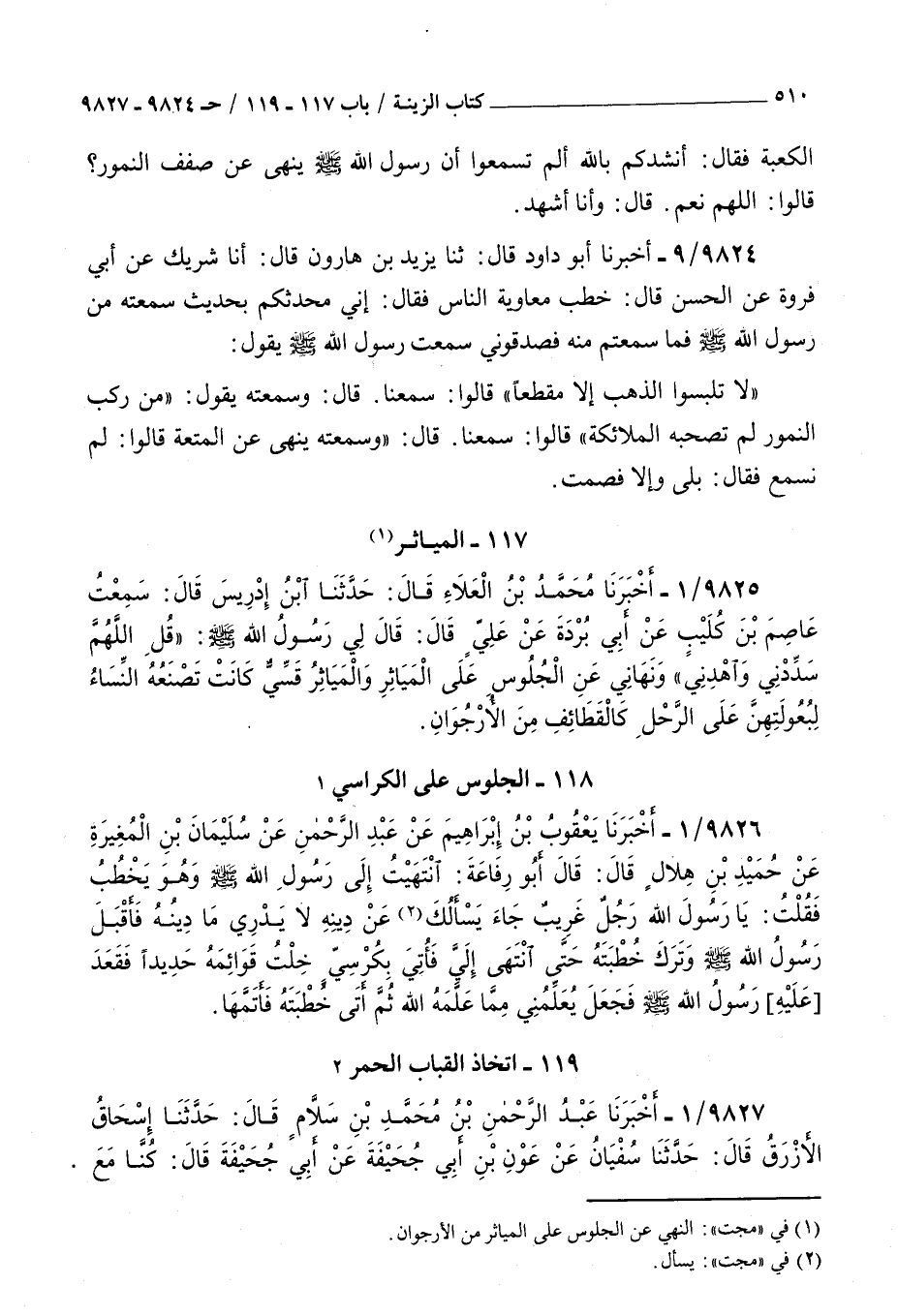 9825 - أخبرنا محمد بن العلاء قال حدثنا بن إدريس قال سمعت عاصم بن كليب عن أبي بردة عن علي قال قال لي رسول الله صلى الله عليه و سلم : قل اللهم سددني واهدني ونهاني عن الجلوس على المياثر والمياثر قسي كانت تصنعه النساء لبعولتهن على الرحل كالقطائف من الأرجوان