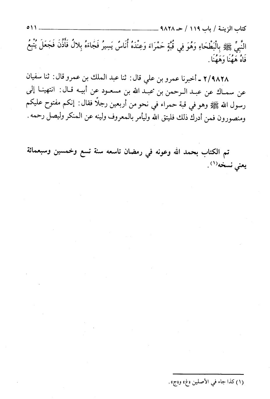 9828 - أخبرنا عمرو بن علي قال ثنا عبد الملك بن عمرو قال ثنا سفيان عن سماك عن عبد الرحمن بن عبد الله بن مسعود عن أبيه قال : انتهينا إلى رسول الله صلى الله عليه و سلم وهو في قبة حمراء في نحو من أربعين رجلا فقال إنكم مفتوح عليكم ومنصورون فمن أدرك ذلك فليتق الله وليأمر بالمعروف ولينه عن المنكر تم الكتاب بحمد الله وعونه في رمضان تاسعه سنة تسع وخمسين وسبعمائة يعني نسخه [ ص 3 ] بسم الله الرحمن الرحيم