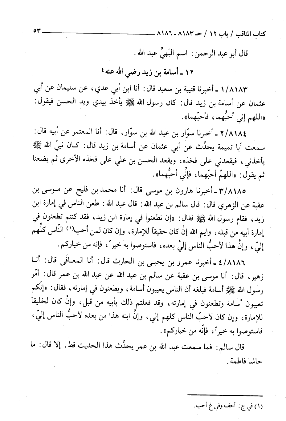 8186 - أخبرنا عمرو بن يحيى بن الحارث قال أنا المعافى قال أنا زهير قال أنا موسى بن عقبة عن سالم بن عبد الله عن عبد الله بن عمر قال : أمر رسول الله صلى الله عليه و سلم أسامة فبلغه أن الناس يعيبون أسامة ويطعنون في إمارته فقال إنكم تعيبون أسامة وتطعنون في إمارته وقد فعلتم ذلك بأبيه من قبل وإن كان لخليقا للإمارة وإن كان لأحب الناس كلهم إلي وإن ابنه هذا من بعده لأحب الناس إلي فاستوصوا به خيرا فإنه من خياركم قال سالم فما سمعت عبد الله بن عمر يحدث هذا الحديث قط إلا قال ما حاشا فاطمة