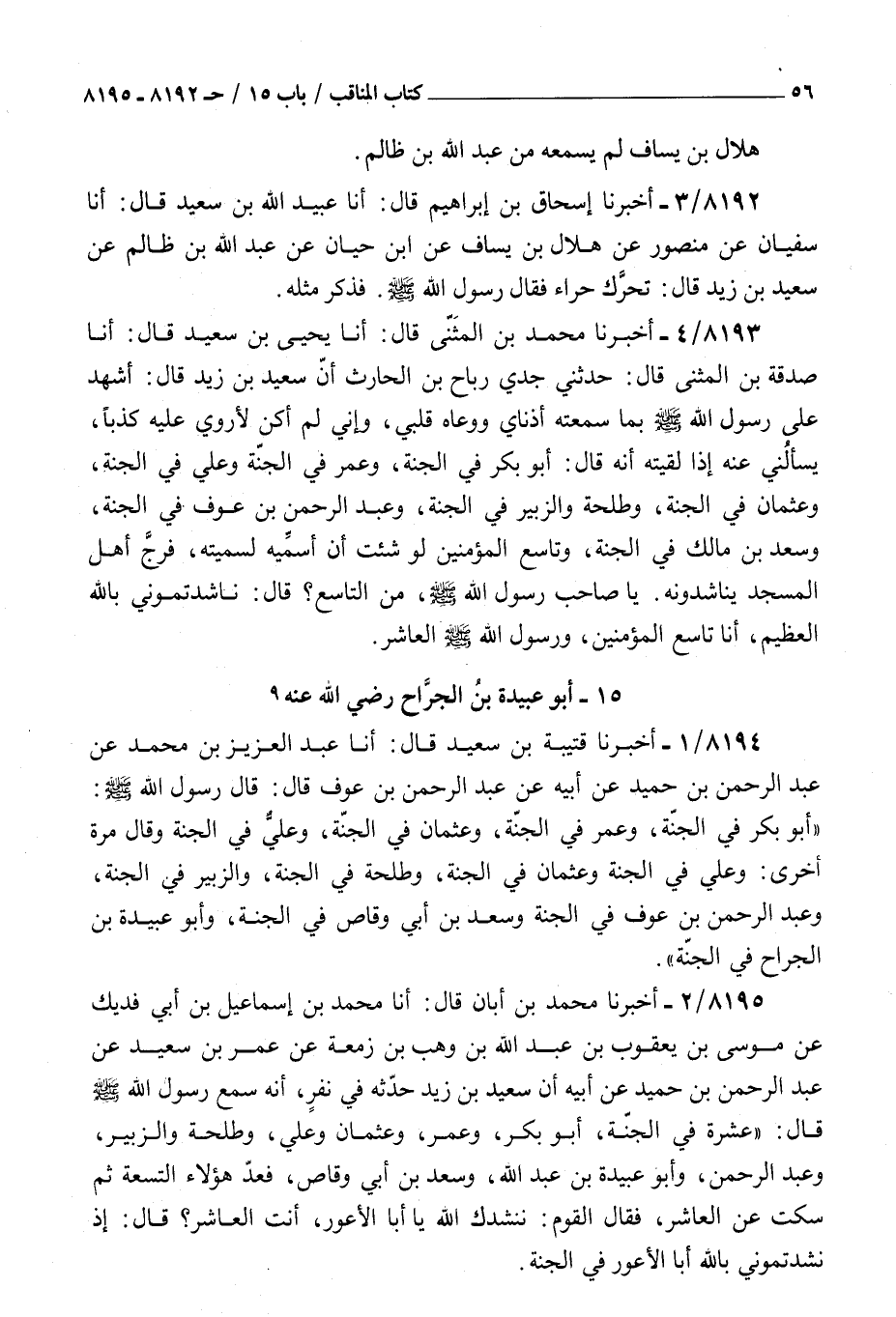 8193 - أخبرنا محمد بن المثنى قال أنا يحيى بن سعيد قال أنا صدقة بن المثنى قال حدثني جدي رباح بن الحارث أن سعيد بن زيد قال : أشهد على رسول الله صلى الله عليه و سلم بما سمعته أذناي ووعاه قلبي وإني لم أكن لأروي عليه كذبا يسألني عنه إذا لقيته أنه قال أبو بكر في الجنة وعمر في الجنة وعلي في الجنة وعثمان في الجنة وطلحة والزبير في الجنة وعبد الرحمن بن عوف في الجنة وسعد بن مالك في الجنة وتاسع المؤمنين لو شئت أن أسميه لسميته فرج أهل المسجد يناشدونه يا صاحب رسول الله صلى الله عليه و سلم من التاسع قال ناشدتموني بالله العظيم أنا تاسع المؤمنين ورسول الله صلى الله عليه و سلم العاشر