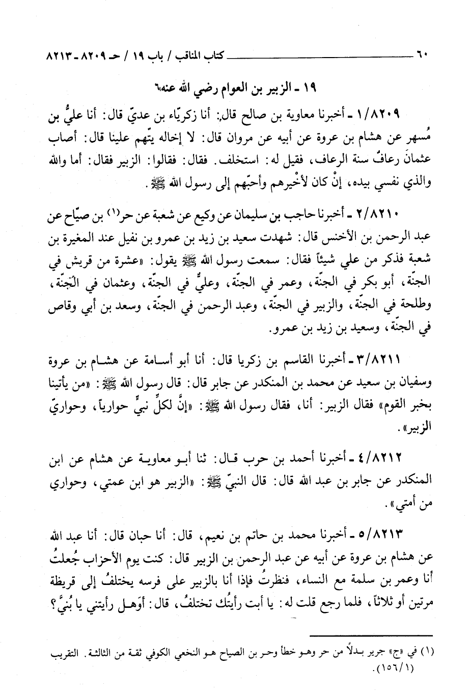 8212 - أخبرنا أحمد بن حرب قال ثنا أبو معاوية عن هشام عن بن المنكدر عن جابر بن عبد الله قال قال النبي صلى الله عليه و سلم : الزبير هو بن عمتي وحواري من أمتي