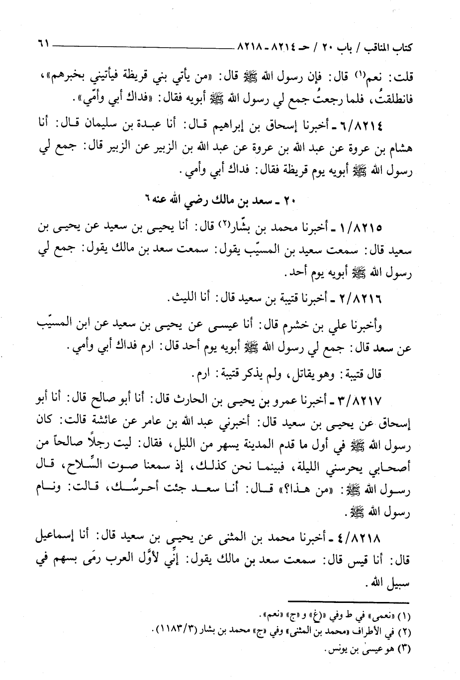8215 - أخبرنا محمد بن بشار قال أنا يحيى بن سعيد عن يحيى بن سعيد قال سمعت سعيد بن المسيب يقول سمعت سعد بن مالك يقول : جمع لي رسول الله صلى الله عليه و سلم أبويه يوم أحد