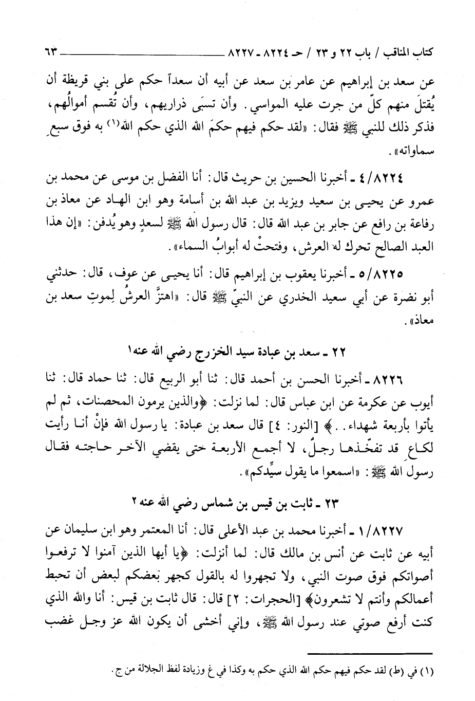 8225 - أخبرنا يعقوب بن إبراهيم قال أنا يحيى عن عوف قال حدثني أبو نضرة عن أبي سعيد الخدري عن النبي صلى الله عليه و سلم قال : اهتز العرش لموت سعد بن معاذ