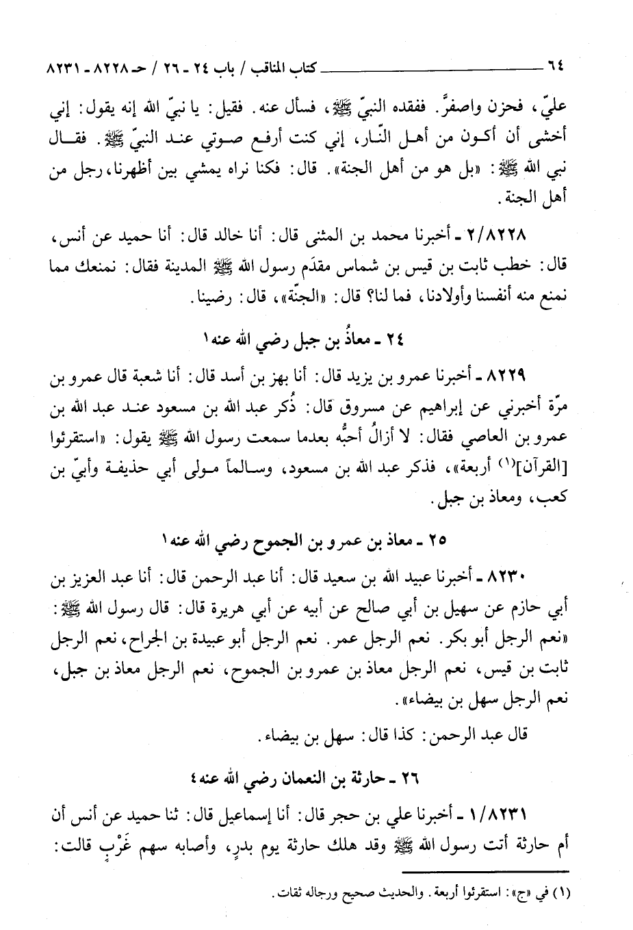 8229 - أخبرنا عمرو بن يزيد قال أنا بهز بن أسد قال أنا شعبة قال عمرو بن مرة أخبرني عن إبراهيم عن مسروق قال : ذكر عبد الله بن مسعود عند عبد الله بن عمرو بن العاصي فقال لا أزال أحبه بعدما سمعت رسول الله صلى الله عليه و سلم يقول استقرئوا القرآن أربعة فذكر عبد الله بن مسعود وسالما مولى أبي حذيفة وأبي بن كعب ومعاذ بن جبل