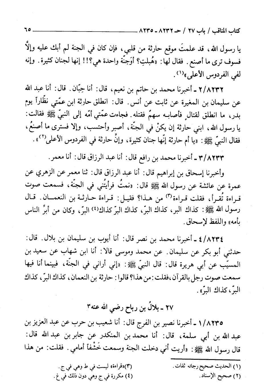 8232 - أخبرنا محمد بن حاتم بن نعيم قال أنا حبان قال أنا عبد الله عن سليمان بن المغيرة عن ثابت عن أنس قال : انطلق حارثة بن عمتي نظارا يوم بدر ما انطلق لقتال فأصابه سهم فقتله فجاءت عمتي أمه إلى النبي صلى الله عليه و سلم فقالت يا رسول الله ابني حارثة إن يكن في الجنة أصبر وأحتسب وإلا فسترى ما أصنع فقال النبي صلى الله عليه و سلم يا أم حارثة إنها جنان كثيرة وإن حارثة في الفردوس الأعلى
