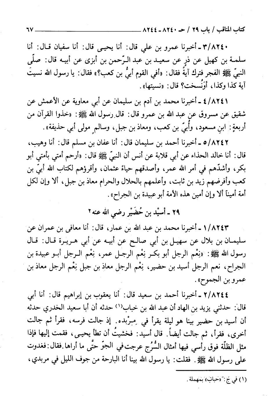 8242 - أخبرنا أحمد بن سليمان قال أنا عفان بن مسلم قال أنا وهيب قال أنا خالد الحذاء عن أبي قلابة عن أنس أن النبي صلى الله عليه و سلم قال : أرحم أمتي بأمتي أبو بكر وأشدهم في أمر الله عمر وأصدقهم حياء عثمان وأقرؤهم لكتاب الله أبي بن كعب وأفرضهم زيد بن ثابت وأعلمهم بالحلال والحرام معاذ بن جبل ألا وإن لكل أمة أمينا ألا وإن أمين هذه الأمة أبو عبيدة بن الجراح