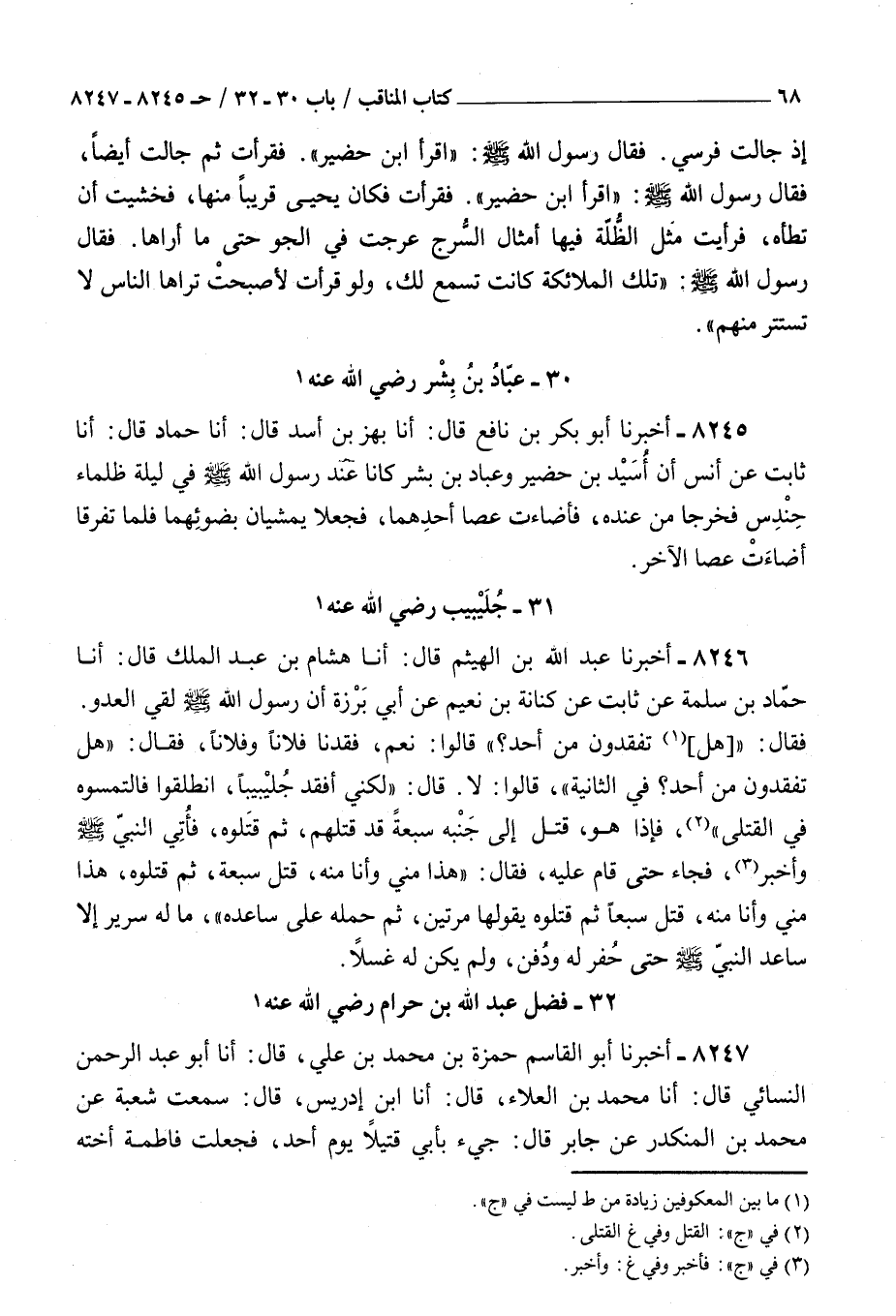 8246 - أخبرنا عبد الله بن الهيثم قال أنا هشام بن عبد الملك قال أنا حماد بن سلمة عن ثابت عن كنانة بن نعيم عن أبي برزة : أن رسول الله صلى الله عليه و سلم لقي العدو فقال هل تفقدون من أحد قالوا نعم فقدنا فلانا وفلانا فقال هل تفقدون من أحد في الثانية قالوا لا قال لكني أفقد جليبيبا انطلقوا فالتمسوه في القتلى فإذا هو قتل إلى جنبه سبعة قد قتلهم ثم قتلوه فأتي النبي صلى الله عليه و سلم وأخبر فجاء حتى قام عليه فقال هذا مني وأنا منه قتل سبعة ثم قتلوه هذا مني وأنا منه قتل سبعا ثم قتلوه يقولها مرتين ثم حمله على ساعده ما له سرير إلا ساعد النبي صلى الله عليه و سلم حتى حفر له ودفن ولم يكن له غسلا