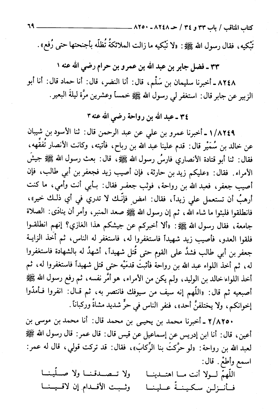 8250 - أخبرنا محمد بن يحيى بن محمد قال أنا محمد بن موسى بن أعين قال أنا بن إدريس عن إسماعيل عن قيس قال قال عمر قال رسول الله صلى الله عليه و سلم لعبد الله بن رواحة : لو حركت بنا الركاب فقال قد تركت قولي قال له عمر أسمع وأطع قال ... اللهم لولا أنت ما اهتدينا ... ولا تصدقنا ولا صلينا ... فأنزلن سكينة علينا ... وثبت الأقدام إن لاقينا فقال رسول الله صلى الله عليه و سلم اللهم ارحمه فقال عمر وجبت