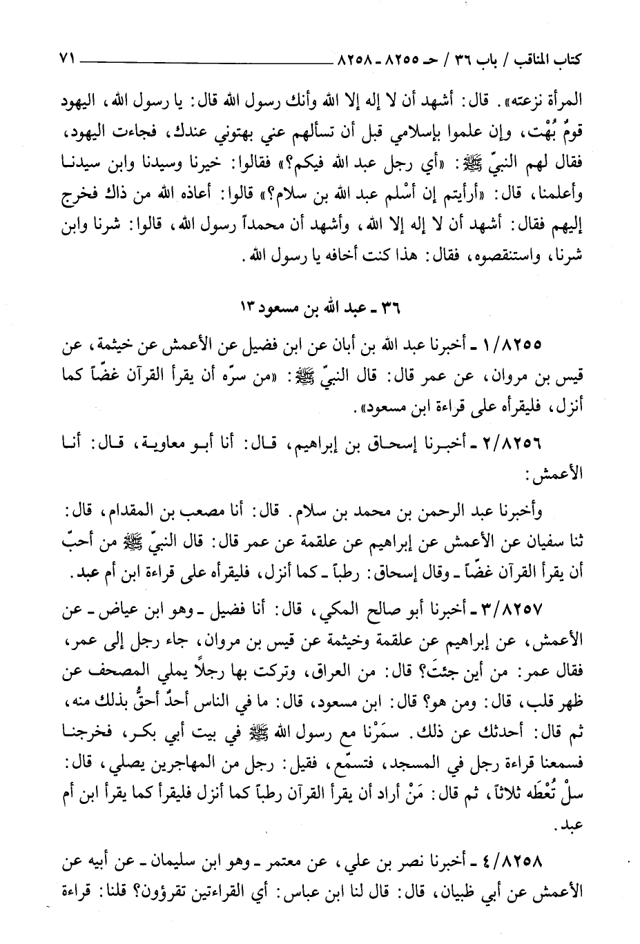 8255 - أخبرنا عبد الله بن أبان عن بن فضيل عن الأعمش عن خيثمة عن قيس بن مروان عن عمر قال قال النبي صلى الله عليه و سلم : من سره أن يقرأ القرآن غضا كما أنزل فليقرأه على قراءة بن مسعود