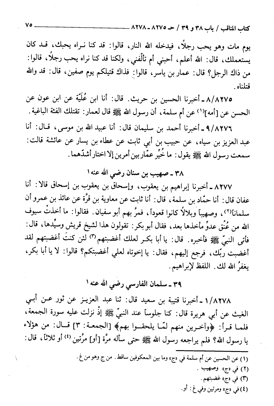 8275 - أخبرنا الحسين بن حريث قال أنا بن علية عن بن عون عن الحسن عن أمه عن أم سلمة أن رسول الله صلى الله عليه و سلم قال لعمار : تقتلك الفئة الباغية