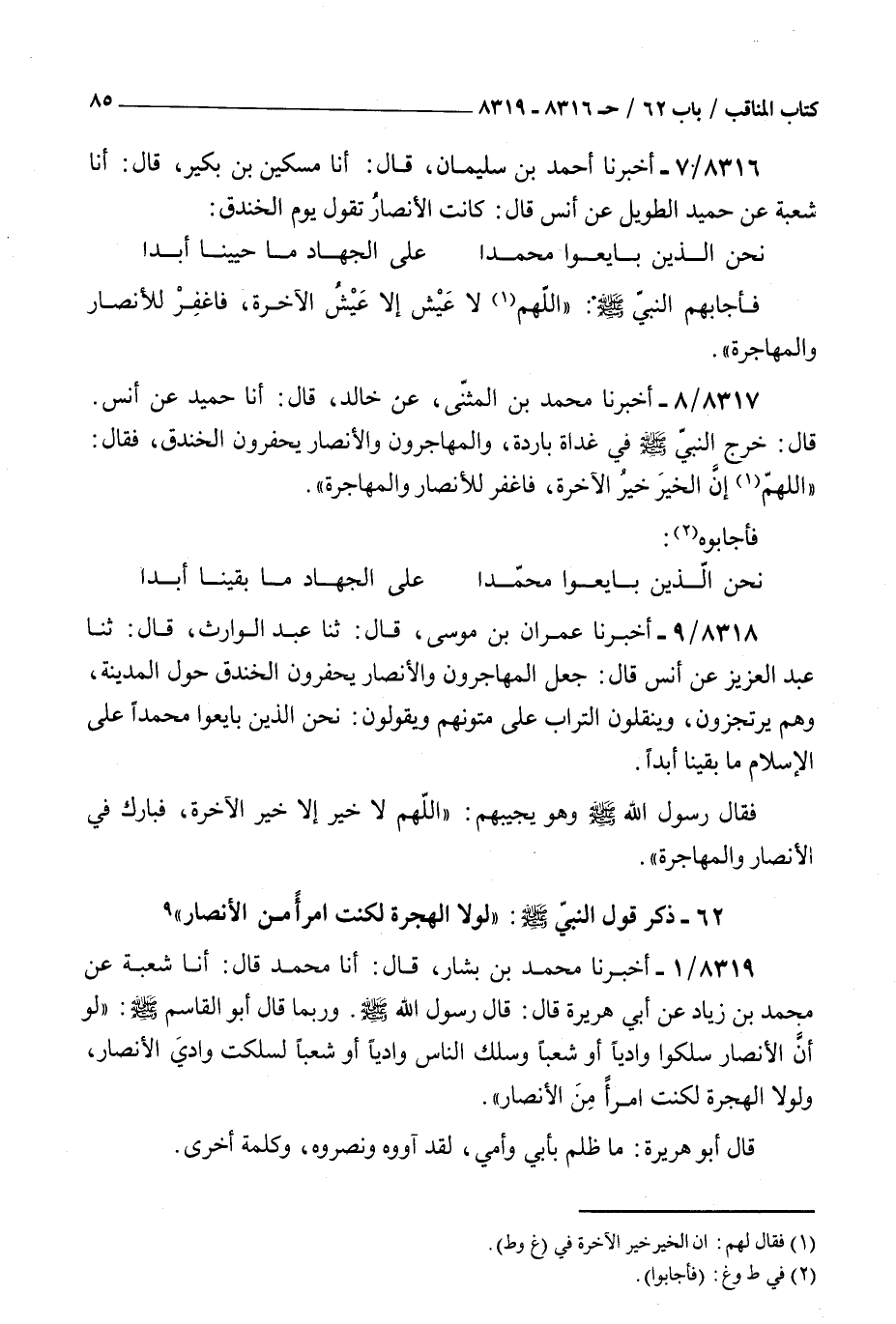 8317 - أخبرنا محمد بن المثنى عن خالد قال أنا حميد عن أنس قال : خرج النبي صلى الله عليه و سلم في غداة باردة والمهاجرون والأنصار يحفرون الخندق فقال اللهم إن الخير خير الآخرة فاغفر للأنصار والمهاجرة فأجابوه ... نحن الذين بايعوا محمدا ... على الجهاد ما بقينا أبدا