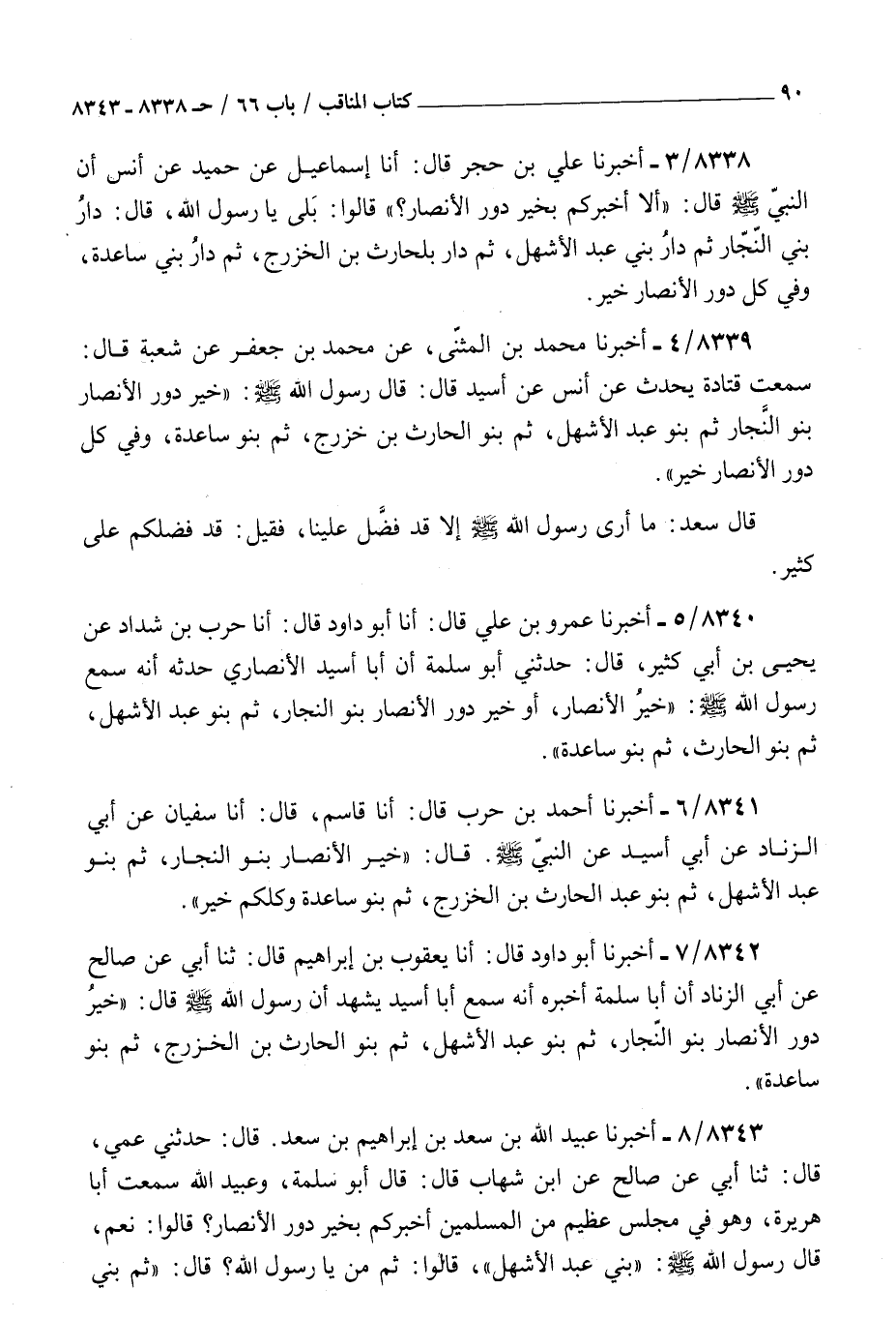 8338 - أخبرنا علي بن حجر قال أنا إسماعيل عن حميد عن أنس أن النبي صلى الله عليه و سلم قال : ألا أخبركم بخير دور الأنصار قالوا بلى يا رسول الله قال دار بني النجار ثم دار بني عبد الأشهل ثم دار بلحارث بن الخزرج ثم دار بني ساعدة وفي كل دور الأنصار خير