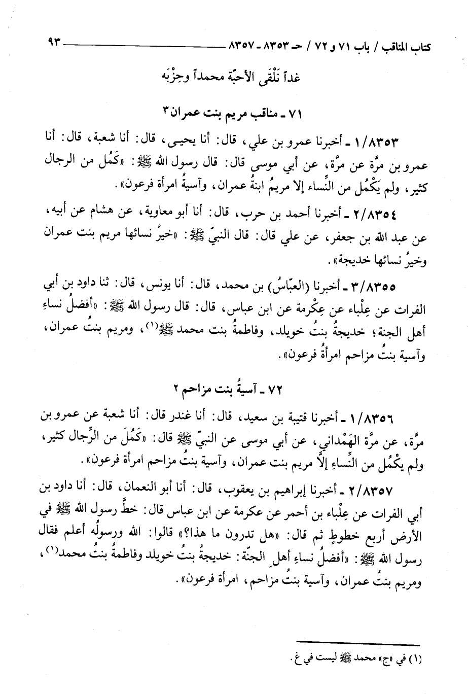 8356 - أخبرنا قتيبة بن سعيد قال أنا غندر قال أنا شعبة عن عمرو بن مرة عن مرة الهمداني عن أبي موسى عن النبي صلى الله عليه و سلم قال : كمل من الرجال كثير ولم يكمل من النساء إلا مريم بنت عمران وآسية بنت مزاحم امرأة فرعون