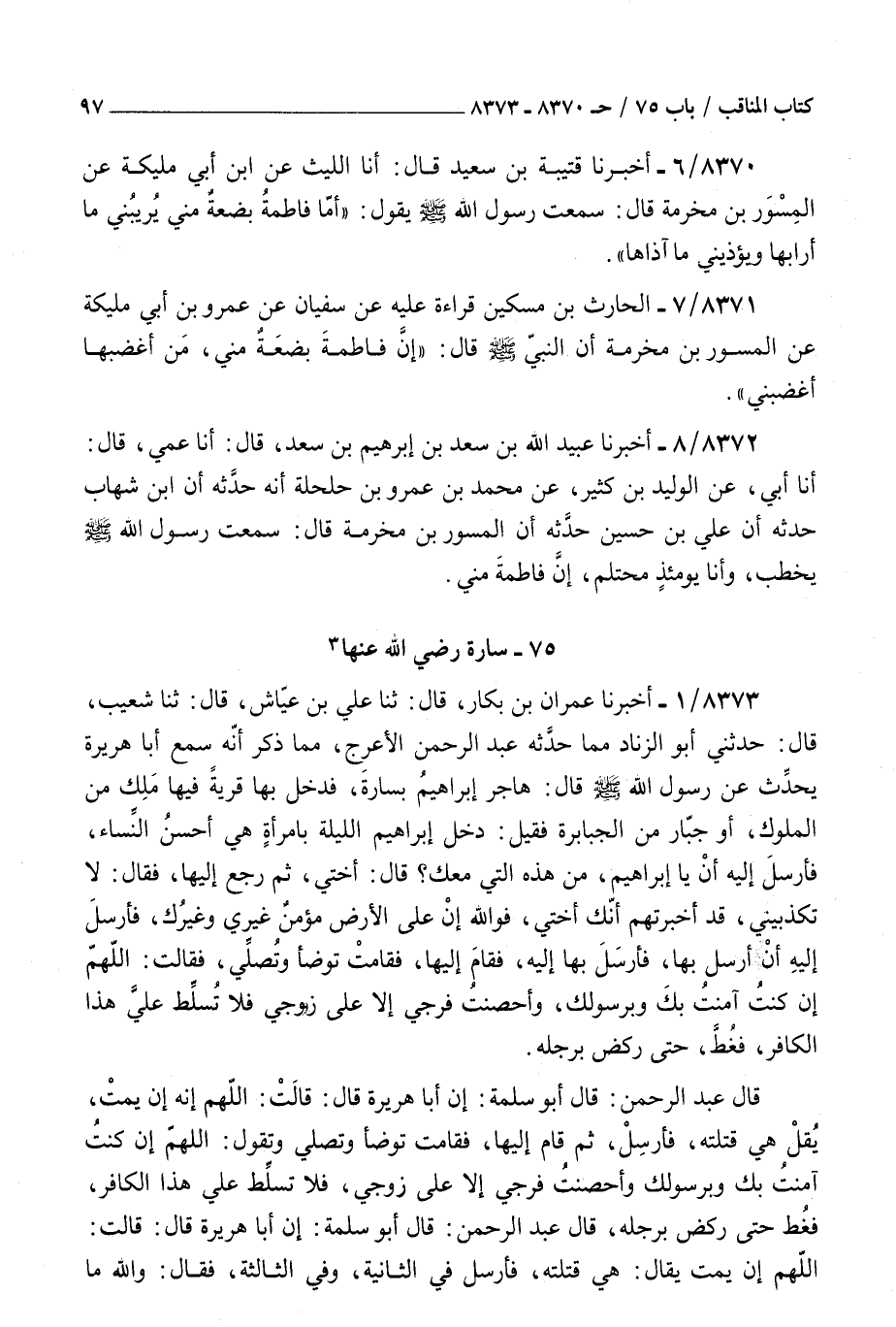 8371 - الحارث بن مسكين قراءة عليه عن سفيان عن عمرو بن أبي مليكة عن المسور بن مخرمة أن النبي صلى الله عليه و سلم قال : إن فاطمة بضعة مني من أغضبها أغضبني