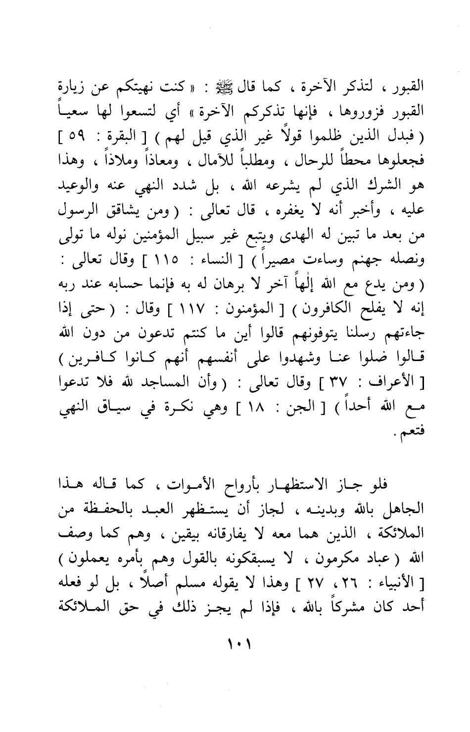القبور، لتذكر الآخرة، كما قال صلى الله عليه وسلم: " كنت نهيتكم عن زيارة القبور، فزوروها، فإنها تذكركم الآخرة " 1، أي: لتسعوا لها سعياً؛ {فَبَدَّلَ الَّذِينَ ظَلَمُوا قَوْلاً غَيْرَ الَّذِي قِيلَ لَهُمْ} [سورة البقرة آية: 59] ، فجعلوها محطاً للرحال، ومطلباً للآمال، ومعاذاً وملاذاً؛ وهذا هو الشرك الذي لم يشرعه الله، بل شدد النهي عنه والوعيد عليه، وأخبر أنه لا يغفره، قال تعالى: {وَمَنْ يُشَاقِقِ الرَّسُولَ مِنْ بَعْدِ مَا تَبَيَّنَ لَهُ الْهُدَى وَيَتَّبِعْ غَيْرَ سَبِيلِ الْمُؤْمِنِينَ نُوَلِّهِ مَا تَوَلَّى وَنُصْلِهِ جَهَنَّمَ وَسَاءَتْ مَصِيراً} [سورة النساء آية: 115] ، وقال تعالى: {وَمَنْ يَدْعُ مَعَ اللَّهِ إِلَهاً آخَرَ لا بُرْهَانَ لَهُ بِهِ فَإِنَّمَا حِسَابُهُ عِنْدَ رَبِّهِ إِنَّهُ لا يُفْلِحُ الْكَافِرُونَ} [سورة المؤمنون آية: 117] ، وقال: {حَتَّى إِذَا جَاءَتْهُمْ رُسُلُنَا يَتَوَفَّوْنَهُمْ قَالُوا أَيْنَ مَا كُنْتُمْ تَدْعُونَ مِنْ دُونِ اللَّهِ قَالُوا ضَلُّوا عَنَّا وَشَهِدُوا عَلَى أَنْفُسِهِمْ أَنَّهُمْ كَانُوا كَافِرِينَ} [سورة الأعراف آية: 37] ، وقال تعالى: {وَأَنَّ الْمَسَاجِدَ لِلَّهِ فَلا تَدْعُو مَعَ اللَّهِ أَحَداً} [سورة الجن آية: 18] ؛ وهي نكرة في سياق النهي فتعم.