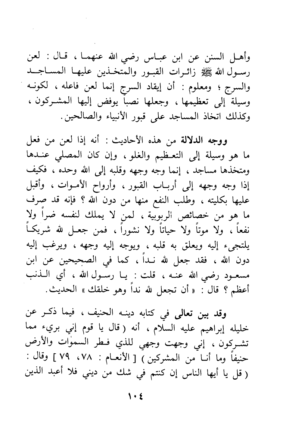 ووجه الدلالة من هذه الأحاديث: أنه إذا لعن من فعل ما هو وسيلة إلى التعظيم والغلو، وإن كان المصلي عندها ومتخذها مساجد إنما وجه وجهه وقلبه إلى الله وحده، فكيف إذا وجه وجهه إلى أرباب القبور، وأرواح الأموات، وأقبل عليها بكليته، وطلب النفع منها من دون الله؟ فإنه قد صرف ما هو من خصائص الربوبية، لمن لا يملك لنفسه ضراً ولا نفعاً، ولا موتاً ولا حياة ولا نشوراً. فمن جعل لله شريكاً يلتجئ إليه ويعلق به قلبه، ويوجه إليه وجهه، ويرغب إليه دون الله، فقد جعل لله نداً، كما في الصحيحين عن ابن مسعود رضي الله عنه: " قلت: يا رسول الله، أي الذنب أعظم؟ قال: أن تجعل لله نداً وهو خلقك " 2 الحديث.