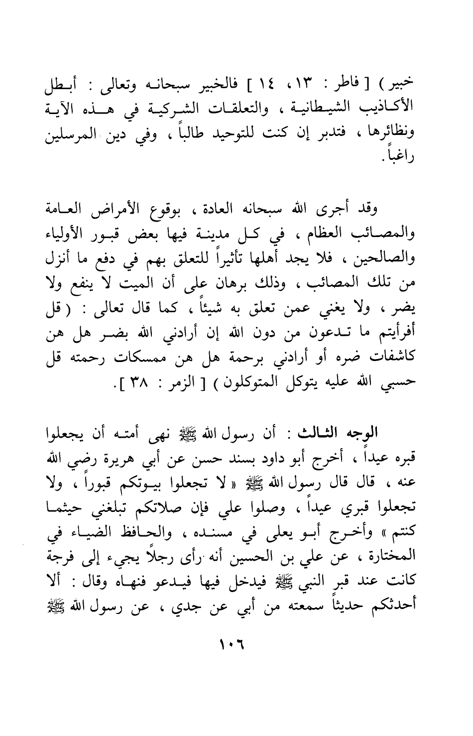 وقد أجرى الله سبحانه العادة، بوقوع الأمراض العامة والمصائب العظام، في كل مدينة فيها بعض قبور الأولياء والصالحين، فلا يجد أهلها تأثيراً للتعلق بهم في دفع ما أنزل من تلك المصائب؛ وذلك برهان على أن الميت لا ينفع ولا يضر، ولا يغني عمن تعلق به شيئاً، كما قال تعالى: {قُلْ أَفَرَأَيْتُمْ مَا تَدْعُونَ مِنْ دُونِ اللَّهِ إِنْ أَرَادَنِيَ اللَّهُ بِضُرٍّ هَلْ هُنَّ كَاشِفَاتُ ضُرِّهِ أَوْ أَرَادَنِي بِرَحْمَةٍ هَلْ هُنَّ مُمْسِكَاتُ رَحْمَتِهِ قُلْ حَسْبِيَ اللَّهُ عَلَيْهِ يَتَوَكَّلُ الْمُتَوَكِّلُونَ} [سورة الزمر آية: 38] .