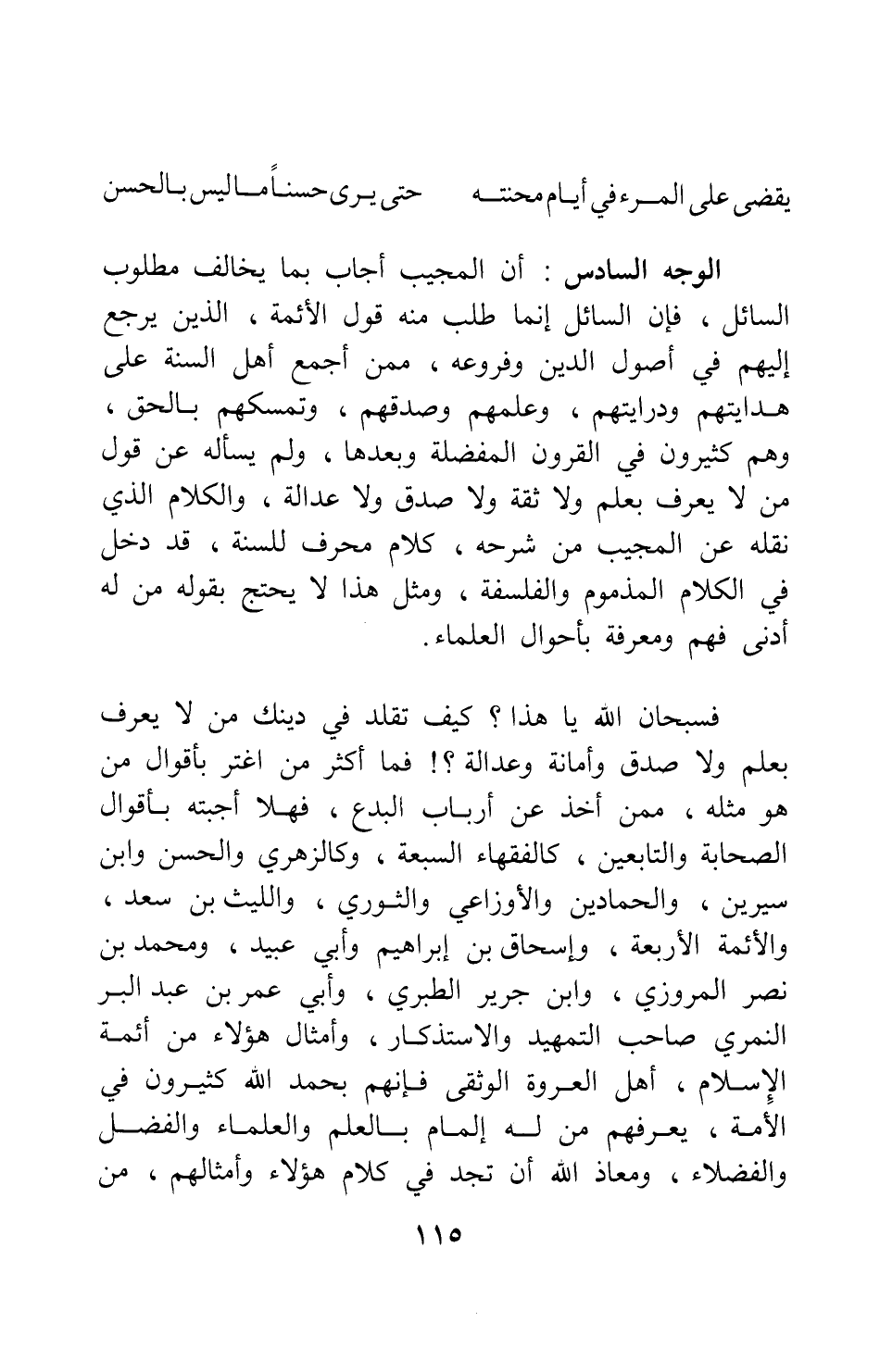 الوجه السادس: أن المجيب أجاب بما يخالف مطلوب السائل، فإن السائل إنما طلب منه قول الأئمة الذين يرجع إليهم في أصول الدين وفروعه، ممن أجمع أهل السنة على هدايتهم ودرايتهم، وعلمهم وصدقهم، وتمسكهم بالحق، وهم كثيرون في القرون المفضلة وبعدها، ولم يسأله عن قول من لا يعرف بعلم ولا ثقة، ولا صدق ولا عدالة؛ والكلام الذي نقله عن المجيب من شرحه، كلام محرف للسنة، قد دخل في الكلام المذموم والفلسفة؛ ومثل هذا لا يحتج بقوله من له أدنى فهم ومعرفة بأحوال العلماء.