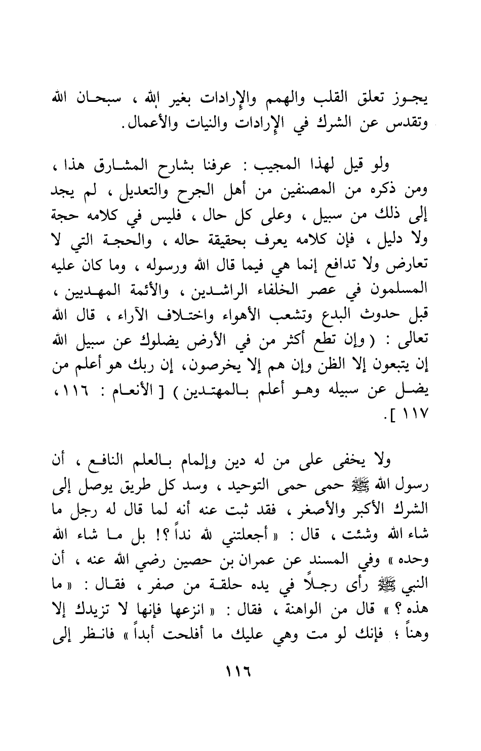 ولا يخفي على من له دين والمام بالعلم النافع، أن رسول الله صلى الله عليه وسلم حمى حمى التوحيد، وسد كل طريق يوصل إلى الشرك الأكبر والأصغر؛ فقد ثبت عنه أنه لما قال له رجل: ما شاء الله وشئت، قال: " أجعلتني لله نداً؟! بل ما شاء الله وحده " 1. وفي المسند عن عمران بن حصين رضي الله عنه أن النبي صلى الله عليه وسلم " رأى رجلاً في يده حلقة من صفر، فقال: ما هذه؟ قال: من الواهنة، فقال: انزعها! فإنها لا تزيدك إلا وهناً; فإنك لو مت وهي عليك ما أفلحت أبداً " 2. فانظر إلى