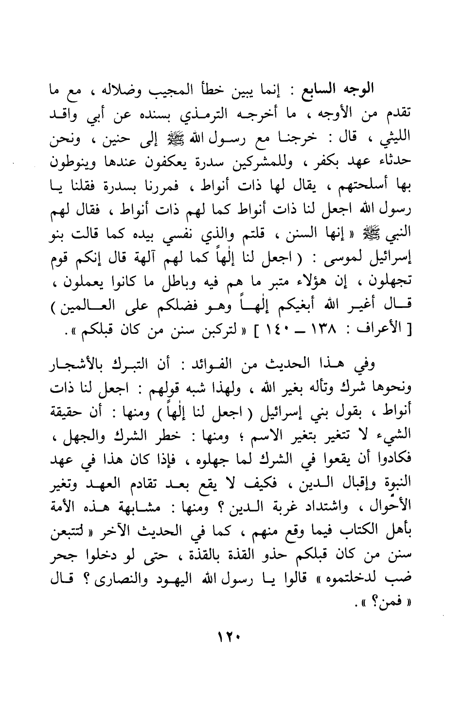 الوجه السابع: إنما يبين خطأ المجيب وضلاله، مع ما تقدم من الأوجه، ما أخرجه الترمذي بسنده عن أبي واقد الليثي، قال: " خرجنا مع رسول الله صلى الله عليه وسلم إلى حنين، ونحن حدثاء عهد بكفر، وللمشركين سدرة يعكفون عندها وينوطون بها أسلحتهم، يقال لها ذات أنواط، فمررنا بسدرة فقلنا: يا رسول الله، اجعل لنا ذات أنواط كما لهم ذات أنواط، فقال لهم النبي صلى الله عليه وسلم: إنها السنن، قلتم والذي نفسي بيده كما قالت بنو إسرائيل لموسى: {اجْعَلْ لَنَا إِلَهاً كَمَا لَهُمْ آلِهَةٌ قَالَ إِنَّكُمْ قَوْمٌ تَجْهَلُونَ إِنَّ هَؤُلاءِ مُتَبَّرٌ مَا هُمْ فِيهِ وَبَاطِلٌ مَا كَانُوا يَعْمَلُونَ قَالَ أَغَيْرَ اللَّهِ أَبْغِيكُمْ إِلَهاً وَهُوَ فَضَّلَكُمْ عَلَى الْعَالَمِينَ} لتركبنّ سنن من كان قبلكم ".