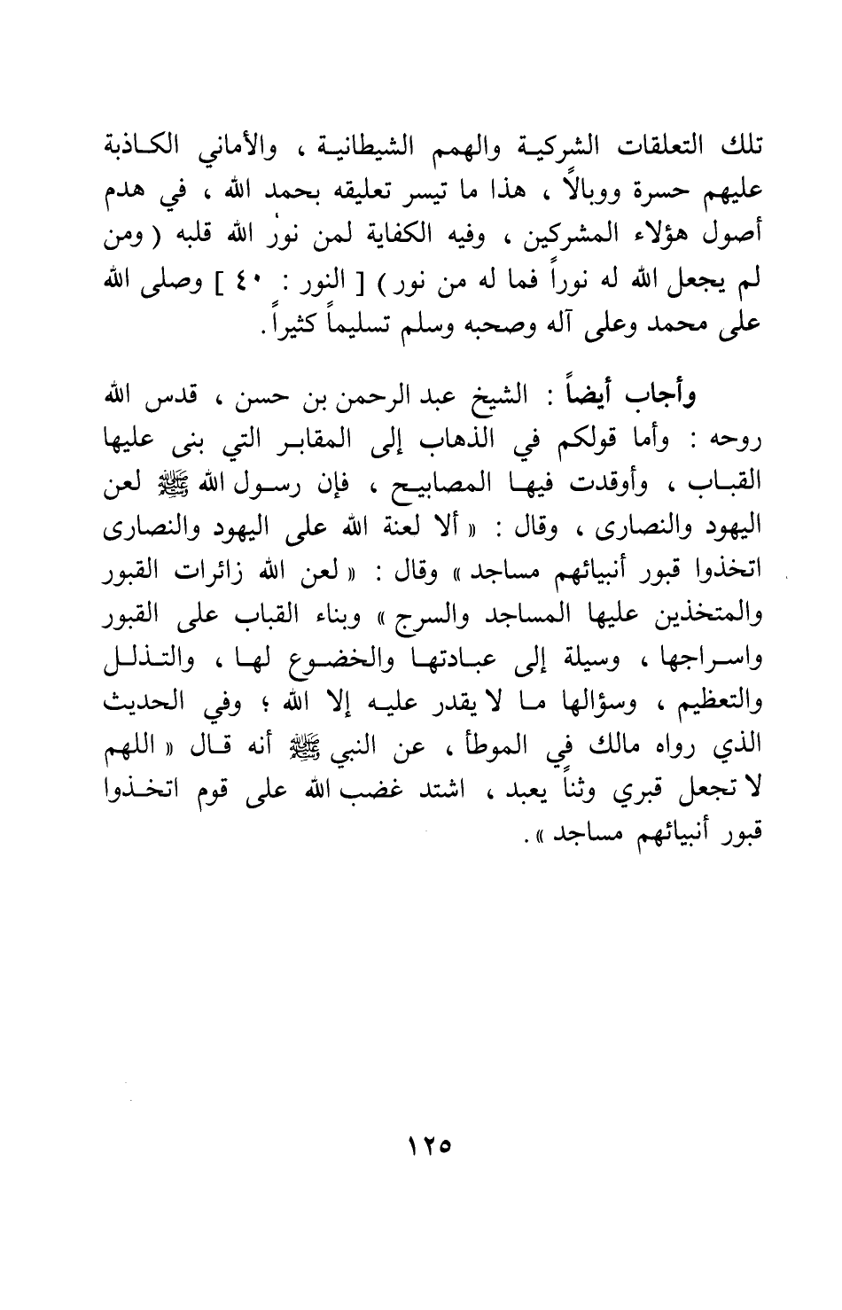 وأجاب أيضاً: الشيخ عبد الرحمن بن حسن، قدس الله روحه: وأما قولكم في الذهاب إلى المقابر التي بني عليها القباب، وأوقدت فيها المصابيح، فإن رسول الله صلى الله عليه وسلم لعن إليهود والنصارى، وقال: " ألا لعنة الله على إليهود والنصارى، اتخذوا قبور أنبيائهم مساجد "، وقال: " لعن الله زائرات القبور والمتخذين عليها المساجد والسرج " 1. وبناء القباب على القبور وإسراجها، وسيلة إلى عبادتها والخضوع لها، والتذلل والتعظيم، وسؤالها ما لا يقدر عليه إلا الله.