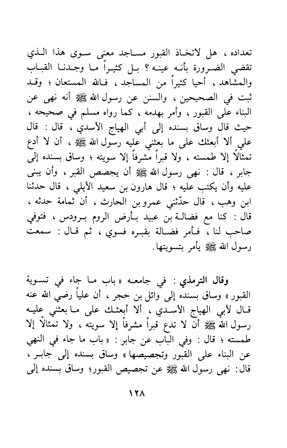 تعداده، هل لاتخاذ القبور مساجد معنى سوى هذا الذي تقضي الضرورة بأنه عينه؟ بل كثيراً ما وجدنا القباب والمشاهد، أحيا كثيراً من المساجد، فالله المستعان.