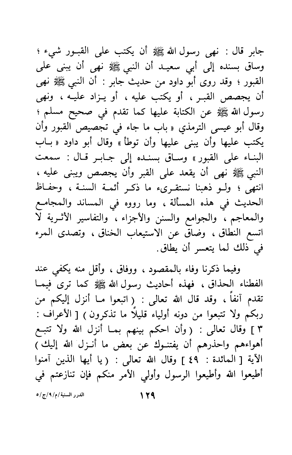جابر، قال: " نهى رسول الله صلى الله عليه وسلم عن تجصيص القبور " 1، وساق بسنده إلى جابر قال: " نهى رسول الله صلى الله عليه وسلم أن يكتب على القبور شيء " 2، وساق بسنده إلى أبي سعيد أن النبي صلى الله عليه وسلم " نهى أن يبنى على القبور " 3. وقد روى أبو داود من حديث جابر أن النبي صلى الله عليه وسلم " نهى أن يجصص القبر، أو يكتب عليه، أو يزاد عليه " 4، ونهى رسول الله صلى الله عليه وسلم عن الكتابة عليها كما تقدم في صحيح مسلم; وقال أبو عيسى الترمذي: باب ما جاء في تجصيص القبور وأن يكتب عليها وأن يبنى عليها وأن توطأ، وقال أبو داود: باب البناء على القبور، وساق بسنده إلى جابر قال: سمعت النبي صلى الله عليه وسلم " نهى أن يقعد على القبر، وأن يجصص ويبنى عليه " 5. انتهى. ولو ذهبنا نستقرئ ما ذكر أئمة السنة، وحفاظ الحديث في هذه المسألة، وما رووه في المساند والمجامع والمعاجم، والجوامع والسنن والأجزاء، والتفاسير الأثرية، لاتسع النطاق، وضاق عن الاستيعاب الخناق، وتصدى المرء في ذلك لما يتعسر أن يطاق. وفيما ذكرنا وفاء بالمقصود ووفاق، وأقل منه يكفي عند الفطناء الحذاق. فهذه أحاديث رسول الله صلى الله عليه وسلم كما ترى فيما تقدم آنفاً، وقد قال الله تعالى: {اتَّبِعُوا مَا أُنْزِلَ إِلَيْكُمْ مِنْ رَبِّكُمْ وَلا تَتَّبِعُوا مِنْ دُونِهِ أَوْلِيَاءَ قَلِيلاً مَا تَذَكَّرُونَ} [سورة الأعراف آية: 3] ، وقال تعالى: {وَأَنِ احْكُمْ بَيْنَهُمْ بِمَا أَنْزَلَ اللَّهُ وَلا تَتَّبِعْ أَهْوَاءَهُمْ وَاحْذَرْهُمْ أَنْ يَفْتِنُوكَ عَنْ بَعْضِ مَا أَنْزَلَ اللَّهُ إِلَيْكَ} الآية [سورة المائدة آية: 49] ، وقال الله تعالى: {يَا أَيُّهَا الَّذِينَ آمَنُوا أَطِيعُوا اللَّهَ وَأَطِيعُوا الرَّسُولَ وَأُولِي الْأَمْرِ مِنْكُمْ فَإِنْ تَنَازَعْتُمْ فِي