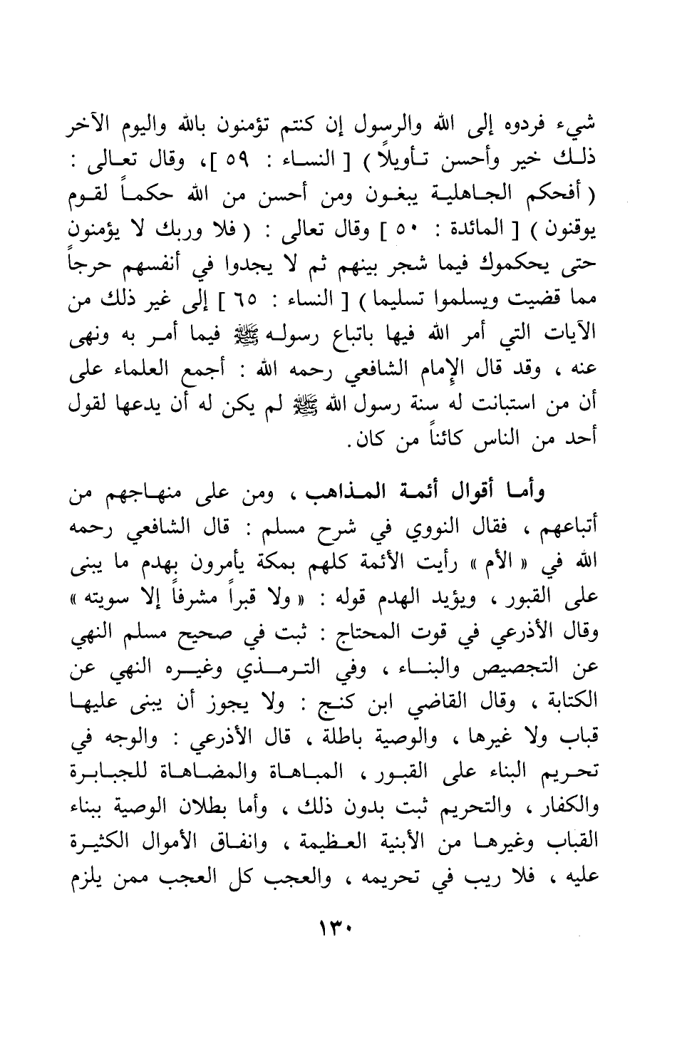 وأما أقوال أئمة المذاهب، ومن على منهاجهم من أتباعهم، فقال النووي في شرح مسلم: قال الشافعي، رحمه الله، في الأم: رأيت الأئمة كلهم بمكة يأمرون بهدم ما يبنى على القبور، ويؤيد الهدم قوله: " ولا قبراً مشرفاً إلا سويته " 1، وقال الأذرعي في قوت المحتاج: ثبت في صحيح مسلم: النهي عن التجصيص والبناء، وفي الترمذي وغيره: النهي عن الكتابة. وقال القاضي ابن كج: ولا يجوز أن يبنى عليها قباب ولا غيرها، والوصية باطلة. قال الأذرعي: والوجه في تحريم البناء على القبور، المباهاة والمضاهاة للجبابرة والكفار، والتحريم ثبت بدون ذلك. وأما بطلان الوصية ببناء القباب وغيرها من الأبنية العظيمة، وإنفاق الأموال الكثيرة عليه، فلا ريب في تحريمه، والعجب كل العجب ممن يلزم