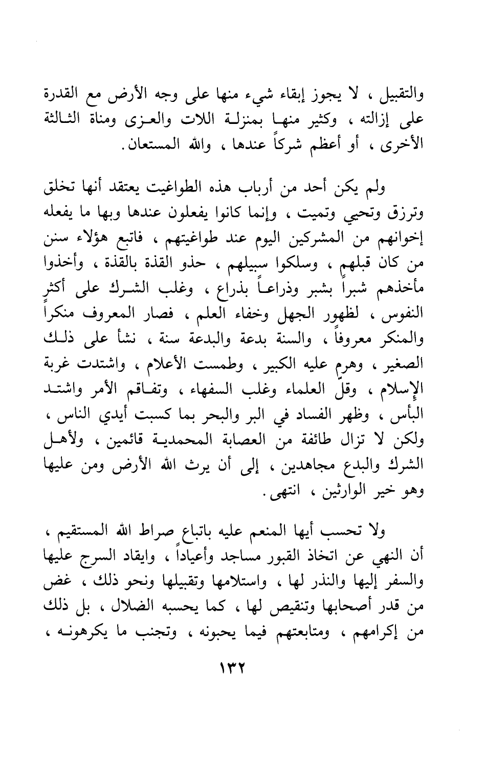 ولم يكن أحد من أرباب هذه الطواغيت يعتقد أنها تخلق وترزق وتحيي وتميت، وإنما كانوا يفعلون عندها وبها ما يفعله إخوانهم من المشركين اليوم عند طواغيتهم، فاتبع هؤلاء سنن من كان قبلهم، وسلكوا سبيلهم، حذو القذة بالقذة، وأخذوا مأخذهم شبراً بشبر وذراعاً بذراع، وغلب الشرك على أكثر النفوس، لظهور الجهل وخفاء العلم، فصار المعروف منكراً والمنكر معروفاً، والسنة بدعة والبدعة سنة؛ نشأ على ذلك الصغير، وهرم عليه الكبير، وطمست الأعلام، واشتدت غربة الإسلام، وقل العلماء وغلب السفهاء، وتفاقم الأمر واشتد البأس، وظهر الفساد في البر والبحر بما كسبت أيدي الناس؛ ولكن لا تزال طائفة من العصابة المحمدية قائمين، ولأهل الشرك والبدع مجاهدين، إلى أن يرث الله الأرض ومن عليها وهو خير الوارثين. انتهى.