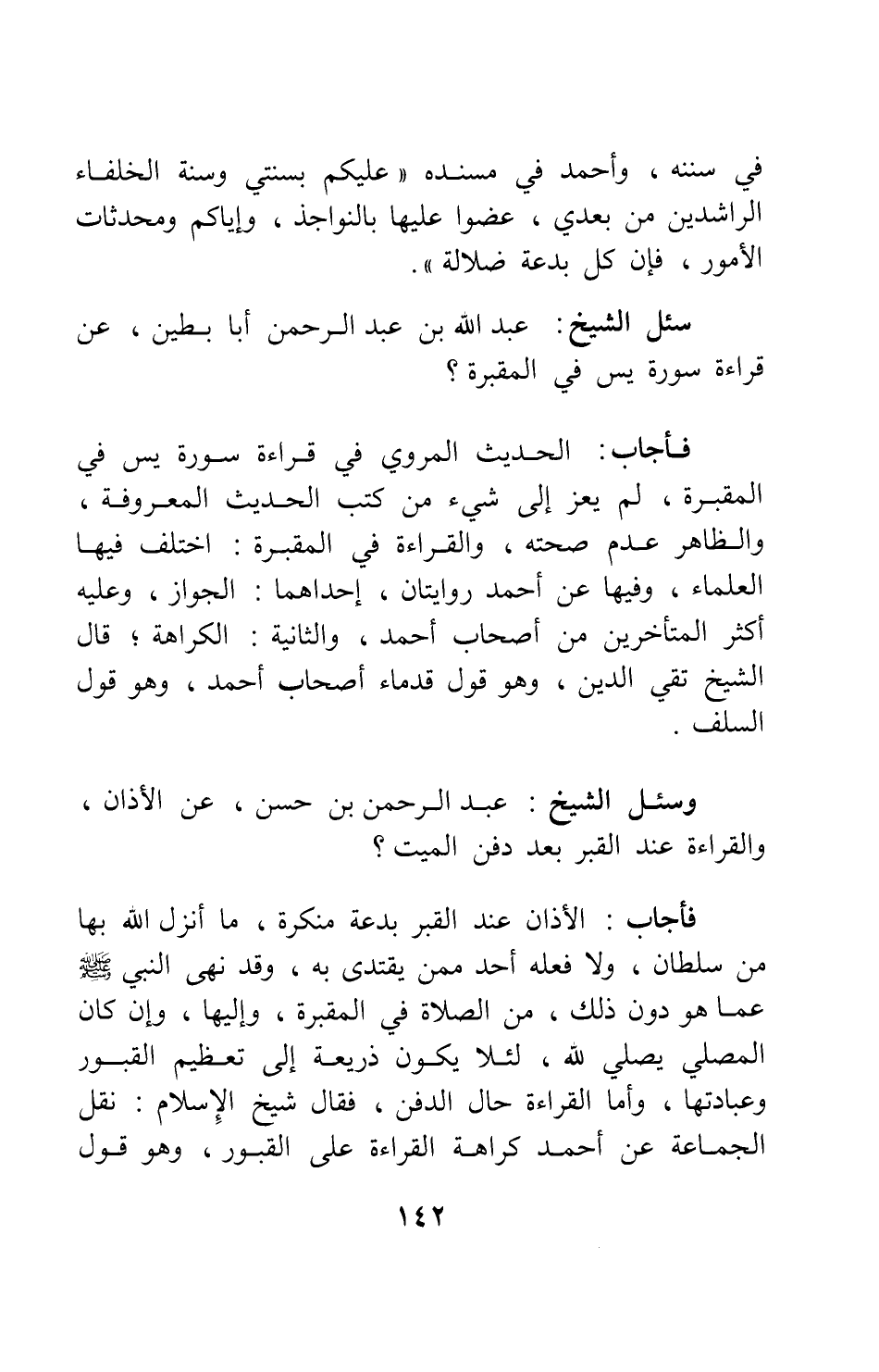 فأجاب: الأذان عند القبر بدعة منكرة، ما أنزل الله بها من سلطان، ولا فعله أحد ممن يقتدى به؛ وقد نهى النبي صلى الله عليه وسلم عما هو دون ذلك، من الصلاة في المقبرة، وإليها، وإن كان المصلي يصلي لله، لئلا يكون ذريعة إلى تعظيم القبور وعبادتها. وأما القراءة حال الدفن، فقال شيخ الإسلام: نقل الجماعة عن أحمد كراهة القراءة على القبور؛ وهو قول