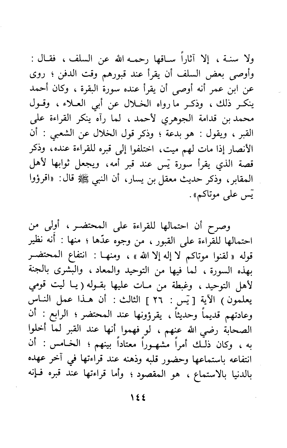 ولا سنة، إلا آثاراً ساقها، رحمه الله عن السلف، فقال: " وأوصى بعض السلف أن يقرأ عند قبورهم وقت الدفن "، روي عن ابن عمر أنه " أوصى أن يقرأ عنده سورة البقرة "، وكان أحمد ينكر ذلك، وذكر ما رواه الخلال عن أبي العلاء، وقول محمد بن قدامة الجوهري لأحمد، لما رآه ينكر القراءة على القبر، ويقول: هو بدعة، وذكر قول الخلال عن الشعبي: أن الأنصار إذا مات لهم ميت، اختلفوا إلى قبره للقراءة عنده، وذكر قصة الذي يقرأ سورة يس عند قبر أمه، ويجعل ثوابها لأهل المقابر، وذكر حديث معقل بن يسار، أن النبي صلى الله عليه وسلم قال: " اقرؤوا يس على موتاكم " 1.