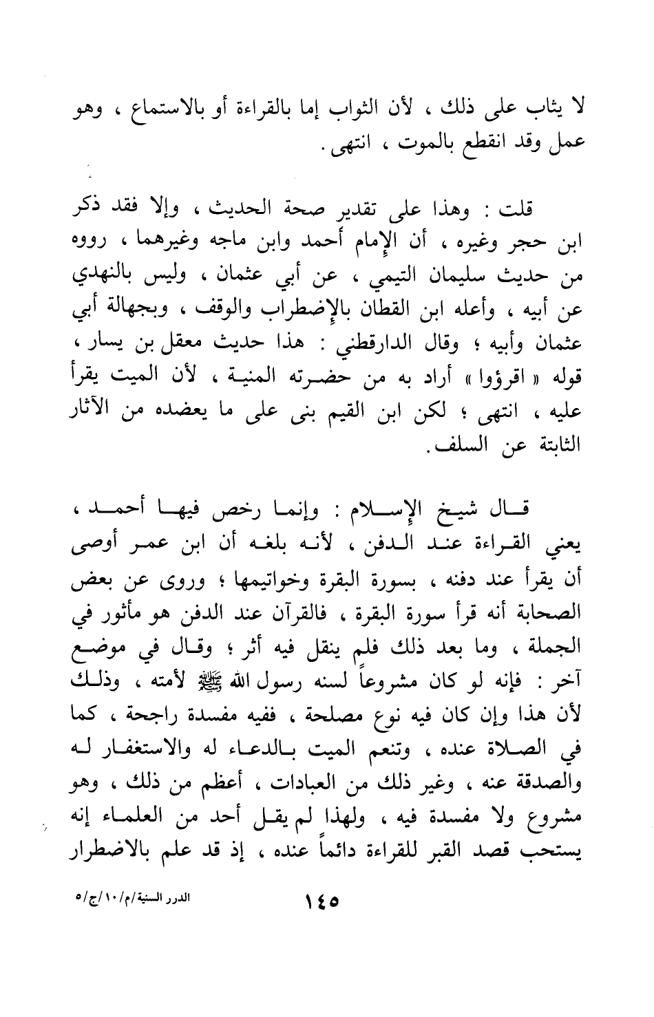 قال شيخ الإسلام: وإنما رخص فيها أحمد، يعني القراءة عند الدفن، لأنه بلغه أن " ابن عمر أوصى أن يقرأ عند دفنه، بسورة البقرة وخواتيمها "، وروى عن بعض الصحابة أنه قرأ سورة البقرة؛ فالقرآن عند الدفن هو مأثور في الجملة، وما بعد ذلك فلم ينقل فيه أثر. وقال في موضع آخر: فإنه لو كان مشروعاً لسنه رسول الله صلى الله عليه وسلم لأمته، وذلك لأن هذا وإن كان فيه نوع مصلحة، ففيه مفسدة راجحة، كما في الصلاة عنده؛ وتنعم الميت بالدعاء له والاستغفار له والصدقة عنه، وغير ذلك من العبادات، أعظم من ذلك، وهو مشروع ولا مفسدة فيه، ولهذا لم يقل أحد من العلماء إنه يستحب قصد القبر للقراءة دائماً عنده، إذ قد علم بالاضطرار