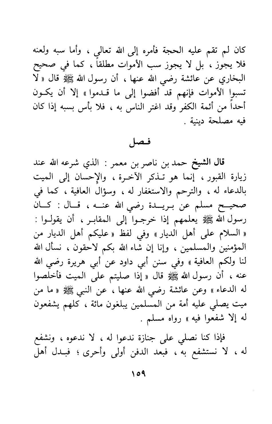 قال الشيخ حمد بن ناصر بن معمر: الذي شرعه الله عند زيارة القبور، إنما هو تذكر الآخرة، والإحسان إلى الميت بالدعاء له، والترحم والاستغفار له، وسؤال العافية، كما في صحيح مسلم عن بريدة رضي الله عنه قال: كان رسول الله صلى الله عليه وسلم يعلمهم إذا خرجوا إلى المقابر، أن يقولوا: " السلام على أهل الديار "، وفي لفظ: " عليكم أهل الديار من المؤمنين والمسلمين، وإنا إن شاء الله بكم لاحقون. نسأل الله لنا ولكم العافية " 2. وفي سنن أبي داود عن أبي هريرة رضي الله عنه أن رسول الله صلى الله عليه وسلم قال: " إذا صليتم على الميت فأخلصوا له الدعاء " 3. وعن عائشة، رضي الله عنها عن النبي صلى الله عليه وسلم: " ما من ميت يصلي عليه أمة من المسلمين يبلغون مائة، كلهم يشفعون له، إلا شفعوا فيه " 4، رواه مسلم.