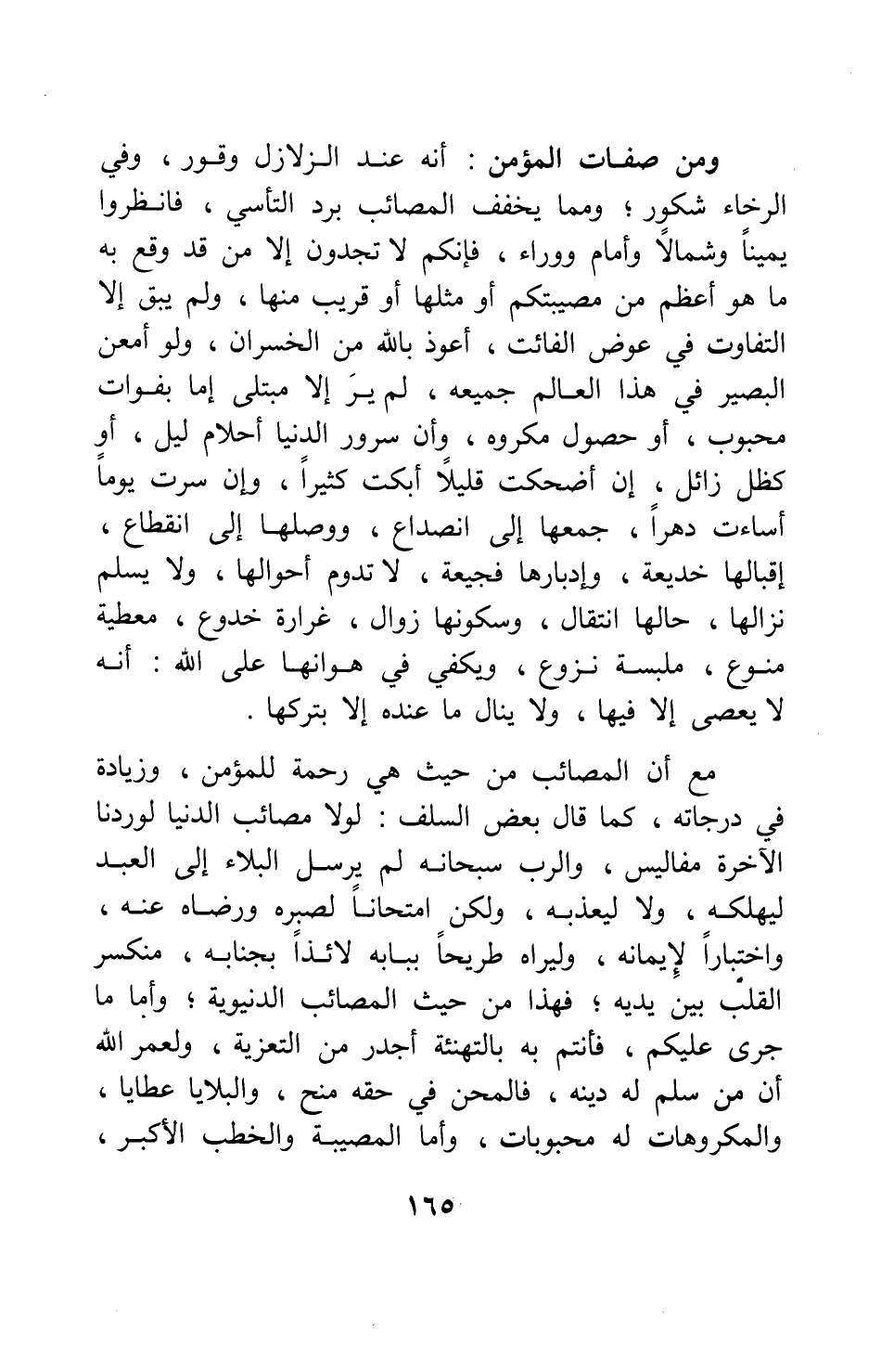 مع أن المصائب من حيث هي رحمة للمؤمن وزيادة في درجاته، كما قال بعض السلف: " لولا مصائب الدنيا، لوردنا الآخرة مفاليس ". والرب سبحانه لم يرسل البلاء إلى العبد ليهلكه، ولا ليعذبه، ولكن امتحاناً لصبره ورضاه عنه، واختباراً لإيمانه، وليراه طريحاً ببابه لائذاً بجنابه، منكسر القلب بين يديه; فهذا من حيث المصائب الدنيوية; وأما ما جرى عليكم، فأنتم به بالتهنئة أجدر من التعزية، ولعمر الله أن من سلم له دينه، فالمحن في حقه منح، والبلايا عطايا، والمكروهات له محبوبات. وأما المصيبة والخطب الأكبر،