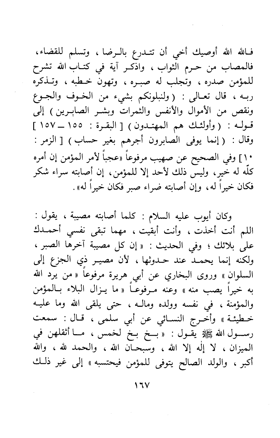 فالله الله! أوصيك أخي أن تتدرع بالرضى، وتسلم للقضاء؛ فالمصاب من حرم الثواب. واذكر آية في كتاب الله تشرح للمؤمن صدره، وتجلب له صبره، وتهون خطبه، وتذكره ربه، قال تعالى: {وَلَنَبْلُوَنَّكُمْ بِشَيْءٍ مِنَ الْخَوْفِ وَالْجُوعِ وَنَقْصٍ مِنَ الأَمْوَالِ وَالأَنْفُسِ وَالثَّمَرَاتِ وَبَشِّرِ الصَّابِرِينَ} إلى قوله: {وَأُولَئِكَ هُمُ الْمُهْتَدُونَ} [سورة البقرة آية: 155-157] ، وقال: {إِنَّمَا يُوَفَّى الصَّابِرُونَ أَجْرَهُمْ بِغَيْرِ حِسَابٍ} [سورة الزمر آية: 10] .