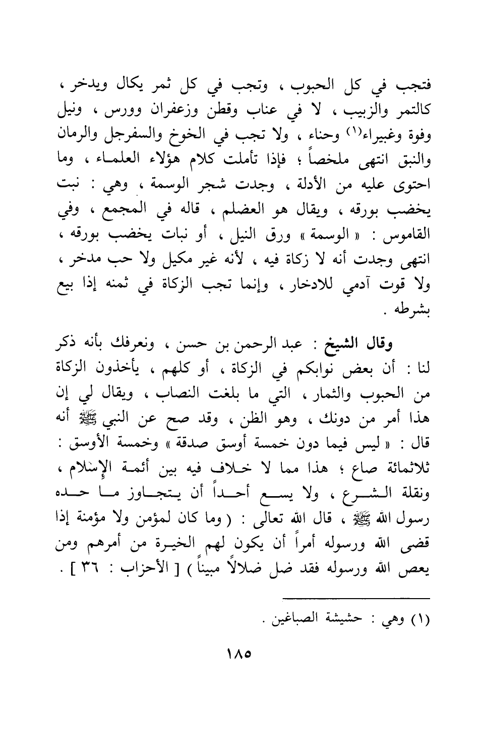 وقال الشيخ عبد الرحمن بن حسن: ونعرفك بأنه ذكر لنا: أن بعض نوابكم في الزكاة أو كلهم، يأخذون الزكاة من الحبوب والثمار التي ما بلغت النصاب، ويقال ل: ي إن هذا أمر من دونك، وهو الظن، وقد صح عن النبي صلى الله عليه وسلم أنه قال: " ليس فيما دون خمسة أوسق صدقة " 2، وخمسة الأوسق: ثلاثمائة صاع; هذا مما لا خلاف فيه بين أئمة الإسلام، ونقلة الشرع، ولا يسع أحداً أن يتجاوز ما حده رسول الله صلى الله عليه وسلم، قال الله تعالى: {وَمَا كَانَ لِمُؤْمِنٍ وَلا مُؤْمِنَةٍ إِذَا قَضَى اللَّهُ وَرَسُولُهُ أَمْراً أَنْ يَكُونَ لَهُمُ الْخِيَرَةُ مِنْ أَمْرِهِمْ وَمَنْ يَعْصِ اللَّهَ وَرَسُولَهُ فَقَدْ ضَلَّ ضَلالاً مُبِيناً} [سورة الأحزاب آية: 36] ،