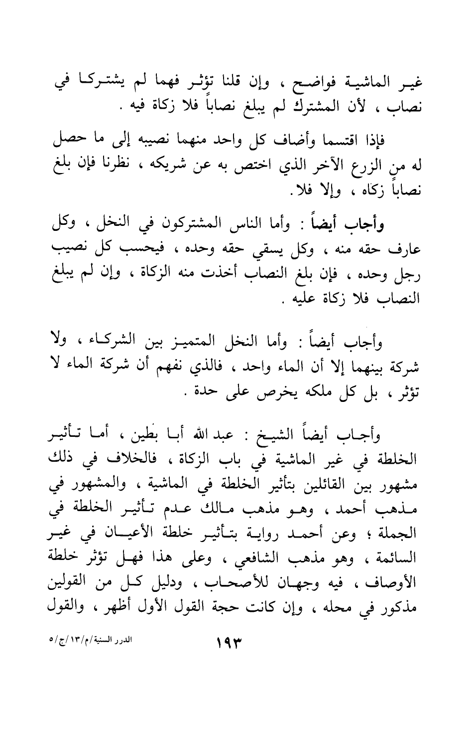 وأجاب أيضاً: الشيخ عبد الله أبا بطين: أما تأثير الخلطة في غير الماشية في باب الزكاة، فالخلاف في ذلك مشهور بين القائلين بتأثير الخلطة في الماشية؛ والمشهور في مذهب أحمد، وهو مذهب مالك: عدم تأثير الخلطة في الجملة. وعن أحمد رواية بتأثير خلطة الأعيان في غير السائمة، وهو مذهب الشافعي. وعلى هذا، فهل تؤثر خلطة الأوصاف؟ فيه وجهان للأصحاب، ودليل كل من القولين مذكور في محله، وإن كانت حجة القول الأول أظهر، والقول
