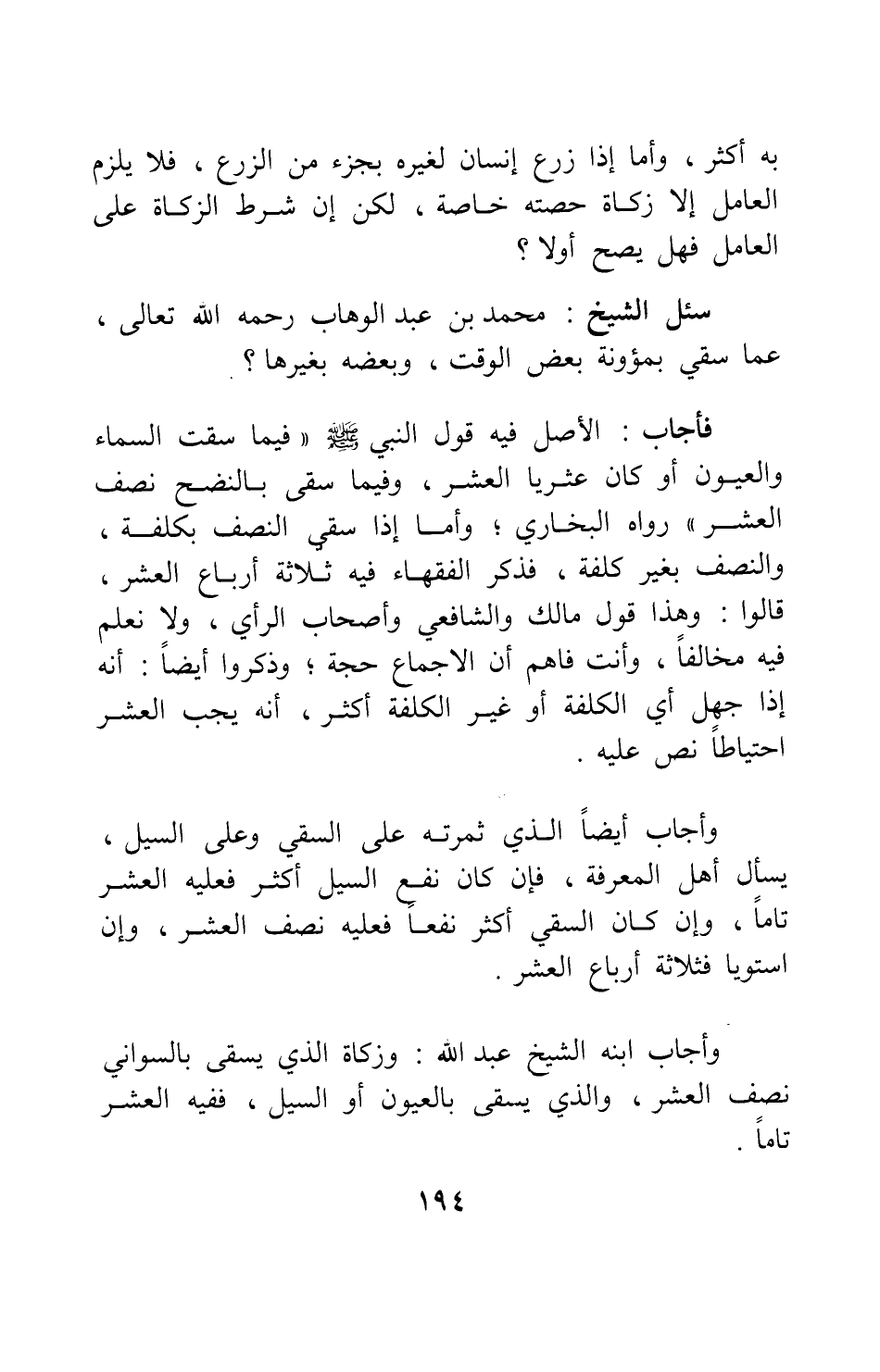 وأجاب ابنه الشيخ عبد الله: وزكاة الذي يسقى بالسواني نصف العشر، والذي يسقى بالعيون أو السيل ففيه العشر تاماً.
