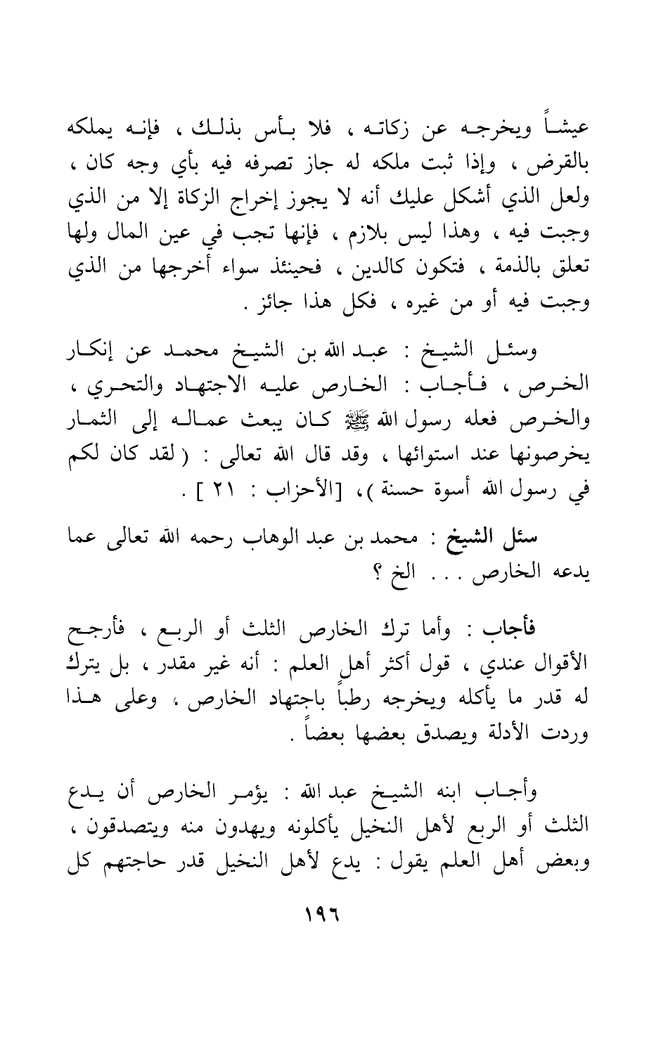 وأجاب ابنه الشيخ عبد الله: يؤمر الخارص أن يدع الثلث أو الربع لأهل النخيل يأكلونه ويهدون منه ويتصدقون، وبعض أهل العلم يقول: يدع لأهل النخيل قدر حاجتهم، كل