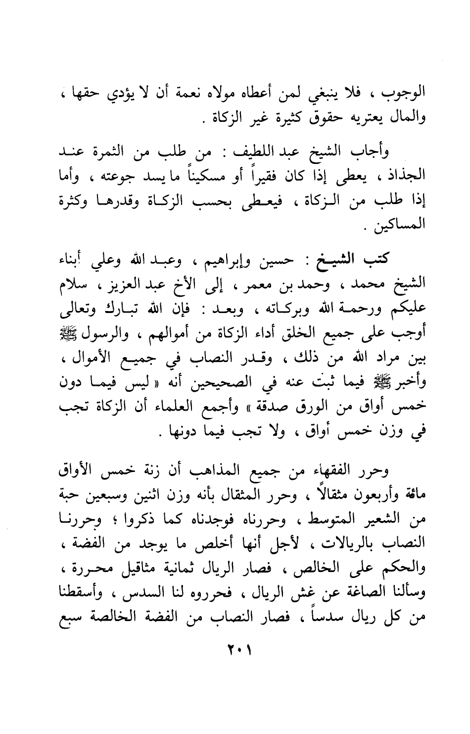 كتب الشيخ حسين وإبراهيم، وعبد الله، وعلي: أبناء الشيخ محمد، وحمد بن معمر: إلى الأخ عبد العزيز، سلام عليكم ورحمة الله وبركاته. وبعد، فإن الله تبارك وتعالى أوجب على جميع الخلق أداء الزكاة من أموالهم، والرسول صلى الله عليه وسلم بين مراد الله من ذلك، وقدر النصاب في جميع الأموال، وأخبر صلى الله عليه وسلم فيما ثبت عنه في الصحيحين أنه: " ليس فيما دون خمس أواق من الورق صدقة " 1.
