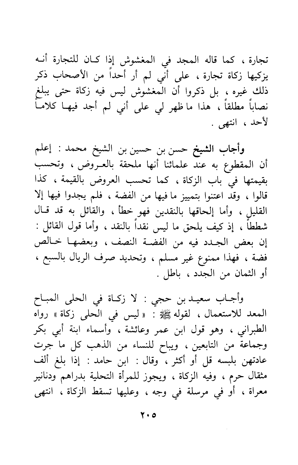 وأجاب الشيخ حسن بن حسين بن الشيخ محمد: اعلم أن المقطوع به عند علمائنا أنها ملحقة بالعروض، وتحسب بقيمتها في باب الزكاة، كما تحسب العروض بالقيمة، كذا قالوا؛ وقد اعتنوا بتمييز ما فيها من الفضة، فلم يجدوا فيها إلا القليل، وأما إلحاقها بالنقدين فهو خطأ، والقائل به قد قال شططاً، إذ كيف يلحق ما ليس نقداً بالنقد؟ وأما قول القائل: إن بعض الجدد فيه من الفضة النصف، وبعضها خالص فضة، فهذا ممنوع غير مسلم، وتحديد صرف الريال بالسبع أو الثمان من الجدد، باطل.