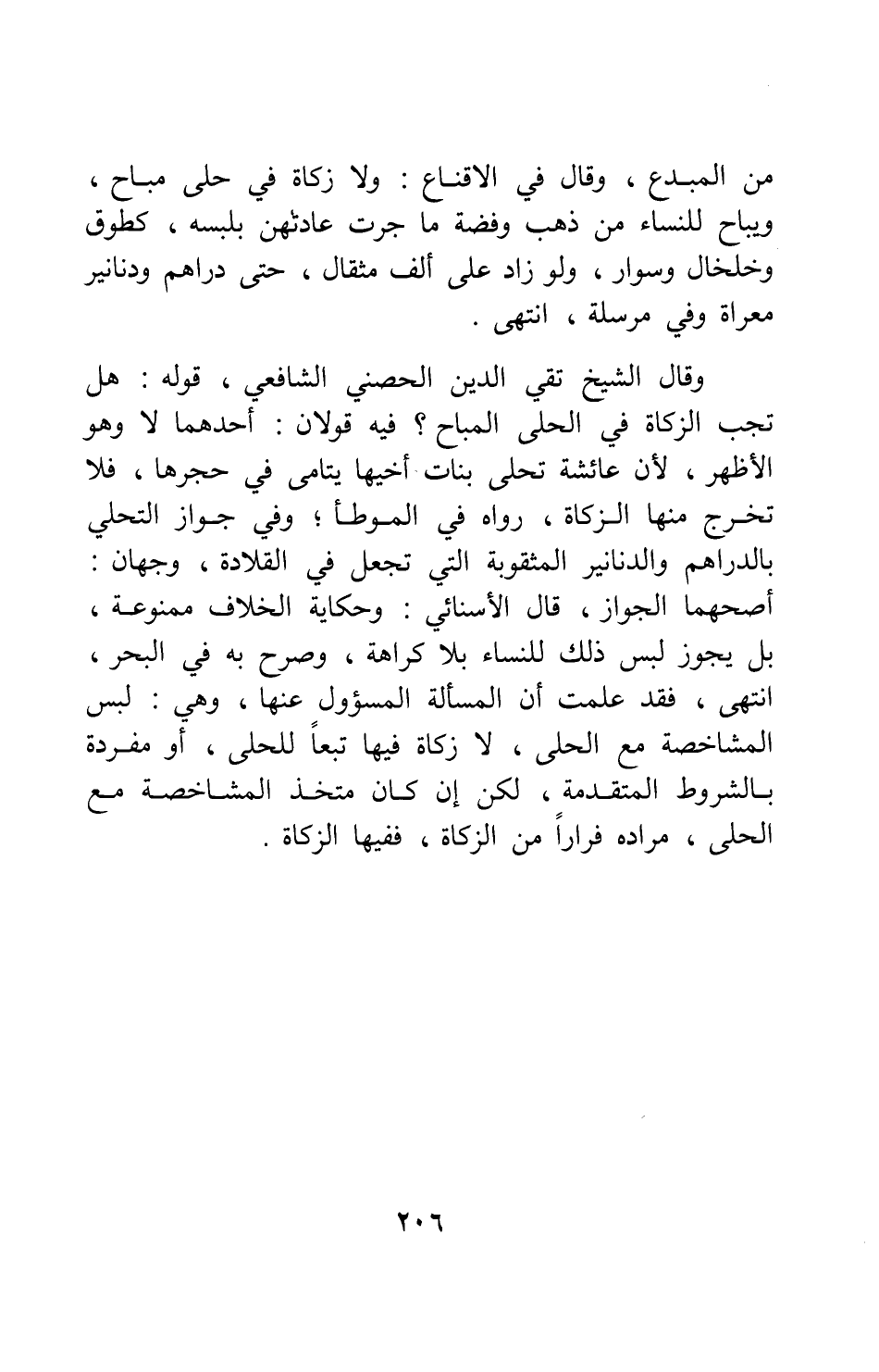 وقال الشيخ تقي الدين الحصني الشافعي: قوله: هل تجب الزكاة في الحلي المباح؟ فيه قولان: أحدهما: لا، وهو الأظهر، لأن " عائشة تحلي بنات أخيها يتامى في حجرها، فلا تخرج منها الزكاة "، رواه في الموطإ. وفي جواز التحلي بالدراهم والدنانير المثقوبة التي تجعل في القلادة، وجهان: أصحهما الجواز، قال الأسنائي: وحكاية الخلاف ممنوعة، بل يجوز لبس ذلك للنساء بلا كراهة، وصرح به في البحر. انتهى. فقد علمت أن المسألة المسؤول عنها، وهي: لبس المشاخصة مع الحلي، لا زكاة فيها تبعاً للحلي، أو مفردة بالشروط المتقدمة، لكن إن كان متخذ المشاخصة مع الحلي، مراده فراراً من الزكاة، ففيها الزكاة.