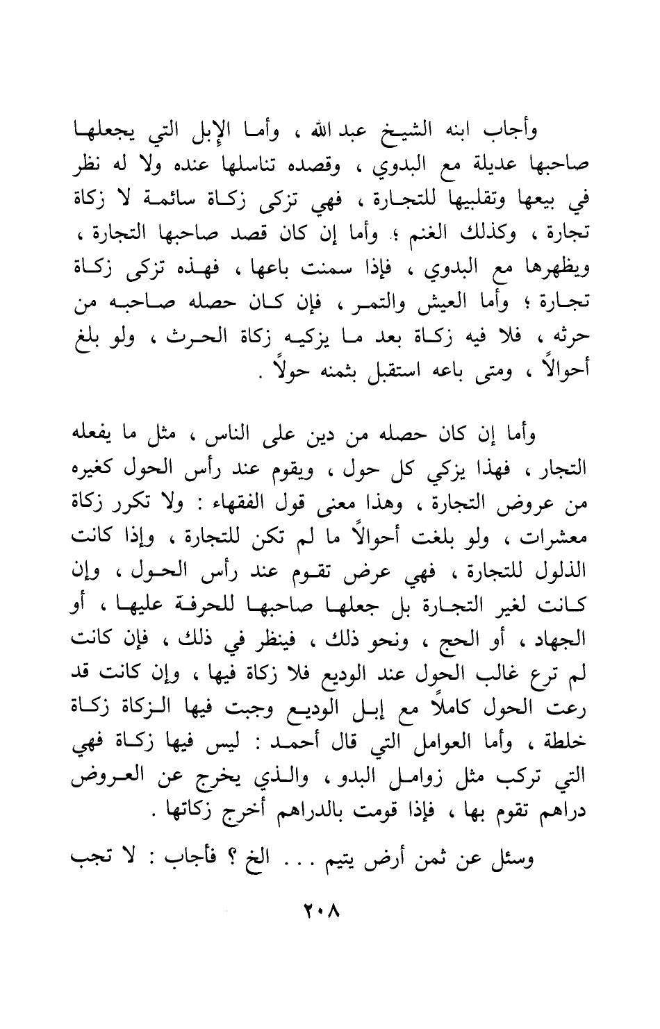 وأجاب ابنه: الشيخ عبد الله: وأما الإبل التي يجعلها صاحبها عديلة مع البدوي، وقصده تناسلها عنده ولا له نظر في بيعها وتقليبها للتجارة، فهي تزكى زكاة سائمة لا زكاة تجارة، وكذلك الغنم. وأما إن كان قصد صاحبها التجارة، ويظهرها مع البدوي، فإذا سمنت باعها، فهذه تزكى زكاة تجارة. وأما العيش والتمر، فإن كان حصله صاحبه من حرثه، فلا فيه زكاة بعد ما يزكيه زكاة الحرث، ولو بلغ أحوالاً، ومتى باعه استقبل بثمنه حولاً.