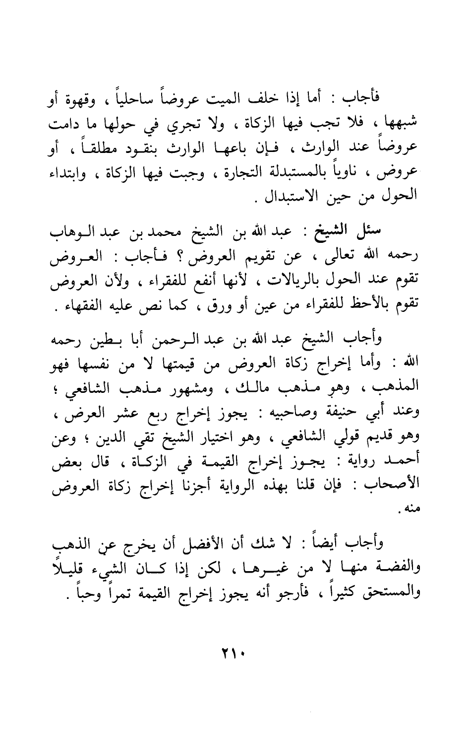 سئل الشيخ عبد الله بن الشيخ محمد بن عبد الوهاب، رحمه الله تعالى: عن تقويم العروض؟ فأجاب: العروض تقوم عند الحول بالريالات، لأنها أنفع للفقراء، ولأن العروض تُقَّوم بالأحظ للفقراء من عين أو وَرِق، كما نص عليه الفقهاء.