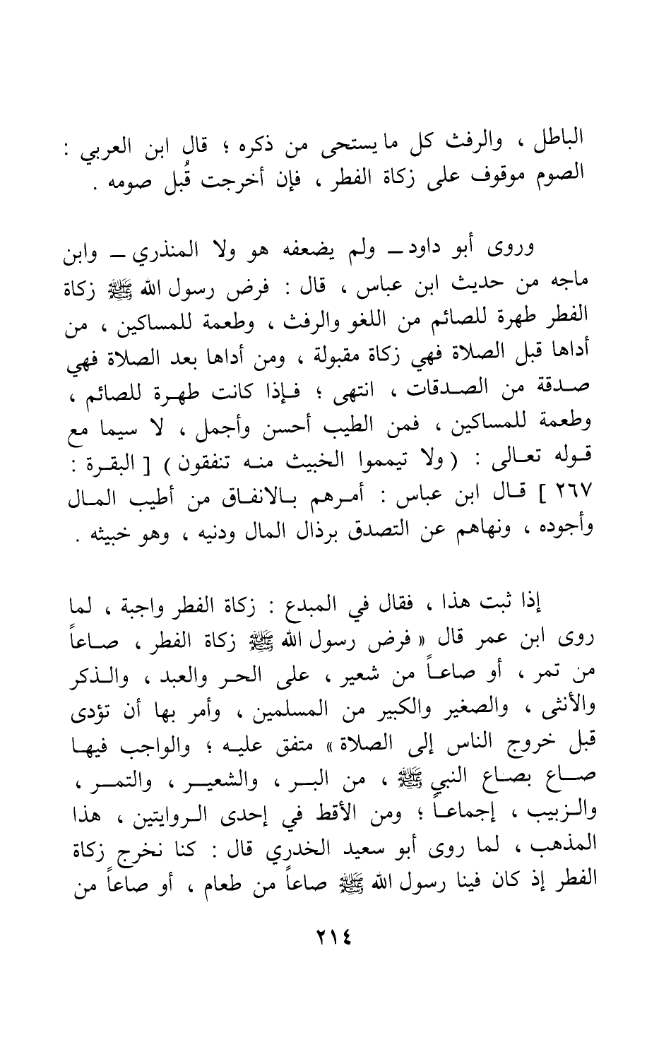 وروى أبو داود - ولم يضعفه هو ولا المنذري - وابن ماجة من حديث ابن عباس، قال: " فرض رسول الله صلى الله عليه وسلم زكاة الفطر طهرة للصائم من اللغو والرفث، وطعمة للمساكين؛ من أداها قبل الصلاة فهي زكاة مقبولة، ومن أداها بعد الصلاة فهي صدقة من الصدقات " 1. انتهى. فإذا كانت طهرة للصائم، وطعمة للمساكين، فمن الطيب أحسن وأجمل، لا سيما مع قوله تعالى: {وَلا تَيَمَّمُوا الْخَبِيثَ مِنْهُ تُنْفِقُونَ} [سورة البقرة آية: 267] ، قال ابن عباس: " أمرهم بالإنفاق من أطيب المال وأجوده، ونهاهم عن التصدق برذال المال ودنيه، وهو خبيثه ".