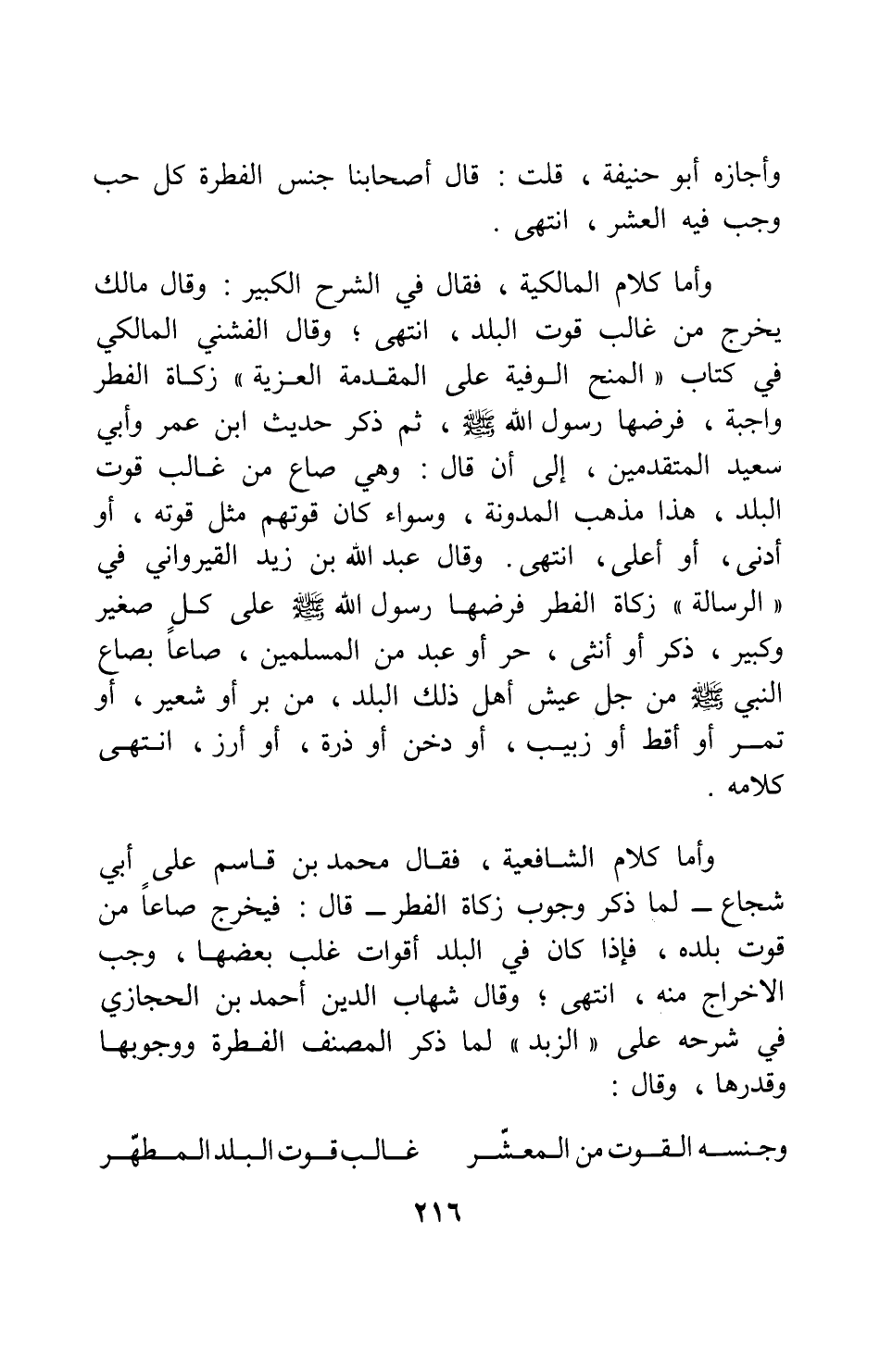 وأما كلام المالكية، فقال في الشرح الكبير: وقال مالك: يخرج من غالب قوت البلد. انتهى. وقال الفشني المالكي في كتاب المنح الوفية على المقدمة العزية: زكاة الفطر واجبة، فرضها رسول الله صلى الله عليه وسلم، ثم ذكر حديث ابن عمر وأبي سعيد المتقدمين، إلى أن قال: وهي صاع من غالب قوت البلد، هذا مذهب المدونة، وسواء كان قوتهم مثل قوته، أو أدنى، أو أعلى. انتهى. وقال عبد الله بن زيد القيرواني في الرسالة: زكاة الفطر فرضها رسول الله صلى الله عليه وسلم على كل صغير وكبير، ذكر أو أنثى، حر أو عبد من المسلمين، صاعاً بصاع النبي صلى الله عليه وسلم من جل عيش أهل ذلك البلد، من بر أو شعير، أو تمر أو أقط أو زبيب، أو دخن أو ذرة، أو أرز. انتهى كلامه. وأما كلام الشافعية، فقال محمد بن قاسم على أبي شجاع - لما ذكر وجوب زكاة الفطر - قال: فيخرج صاعاً من قوت بلده، فإذا كان في البلد أقوات غلب بعضها، وجب الإخراج منه. انتهى. وقال شهاب الدين أحمد بن الحجازي في شرحه على الزبد، لما ذكر المصنف الفطرة ووجوبها وقدرها، وقال:
