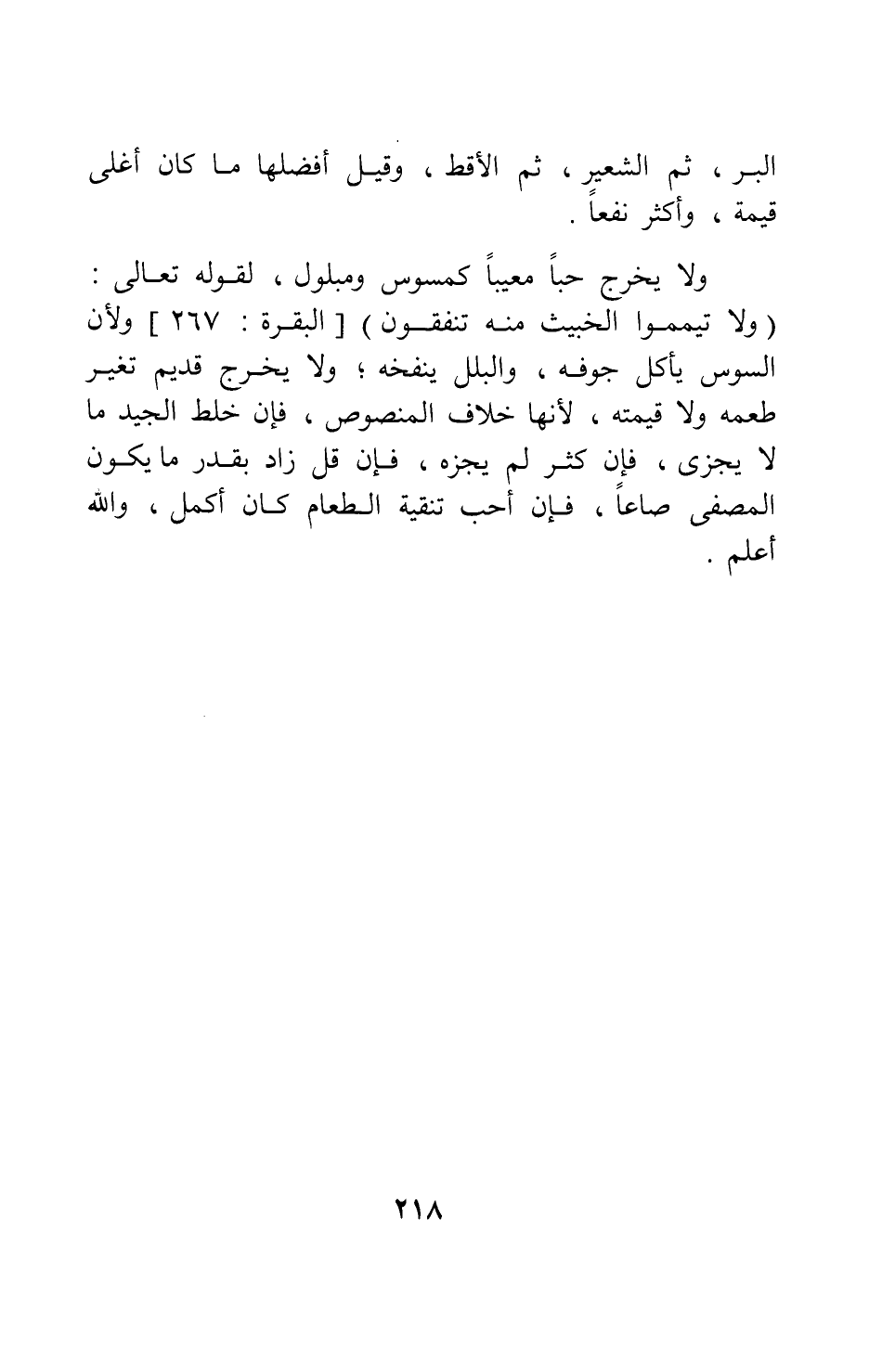 ولا يخرج حباً معيباً كمسوس ومبلول، لقوله تعالى: {وَلا تَيَمَّمُوا الْخَبِيثَ مِنْهُ تُنْفِقُونَ} [سورة البقرة آية: 267] ، ولأن السوس يأكل جوفه، والبلل ينفخه; ولا يخرج قديم تغير طعمه، ولا قيمته لأنها خلاف المنصوص، فإن خلط الجيد ما لا يجزي، فإن كثر لم يجزه، فإن قل زاد بقدر ما يكون المصفى صاعاً؛ فإن أحب تنقية الطعام كان أكمل، والله أعلم.