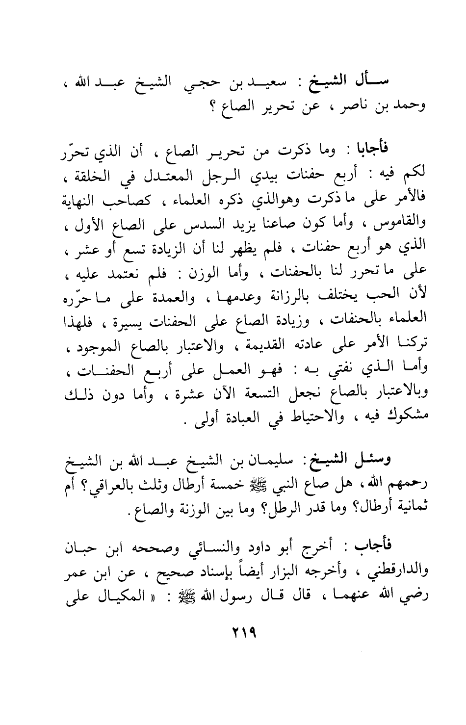 سئل الشيخ سعيد بن حجي الشيخَ عبد الله، وحمد بن ناصر: عن تحرير الصاع؟