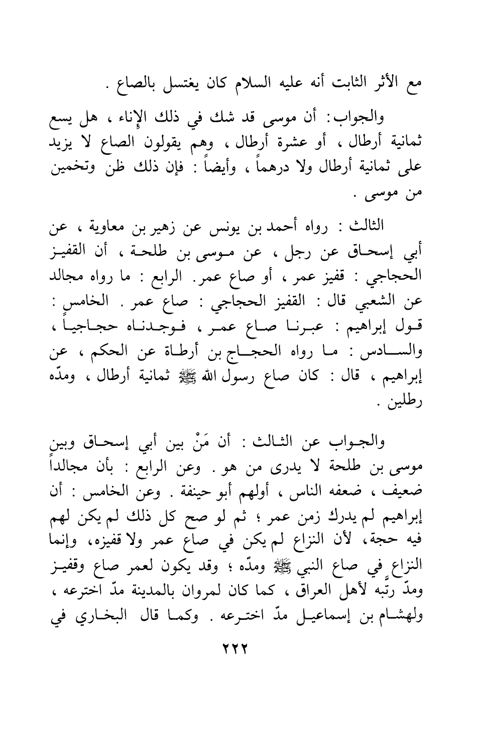 الثالث: رواه أحمد بن يونس عن زهير بن معاوية عن أبي إسحاق عن رجل عن موسى بن طلحة، أن القفيز الحجاجي: قفيز عمر، أو صاع عمر. الرابع: ما رواه مجالد عن الشعبي قال: القفيز الحجاجي: صاع عمر. الخامس: قول إبراهيم: عبرنا صاع عمر، فوجدناه حجاجياً. والسادس: ما رواه الحجاج بن أرطاة عن الحكم عن إبراهيم، قال: كان صاع رسول الله صلى الله عليه وسلم ثمانية أرطال، ومده رطلين.